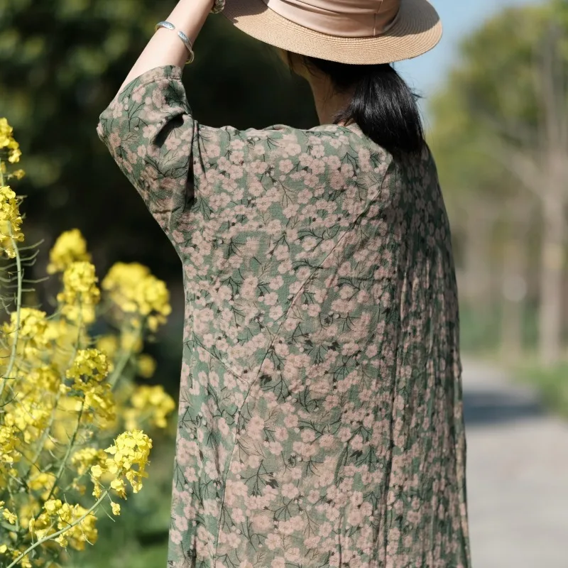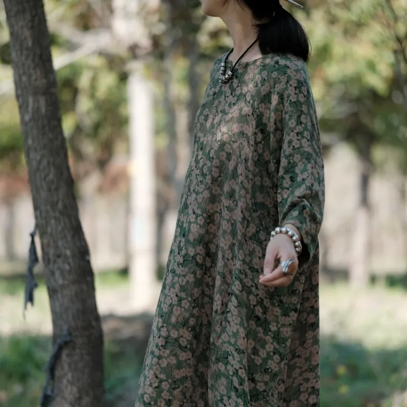 衣都精品- 新款復古文藝做舊寬鬆數位印花連衣裙