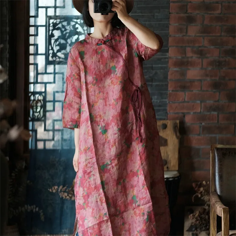 衣都精品- 新款復古水洗數碼印花盤扣繫帶連衣裙