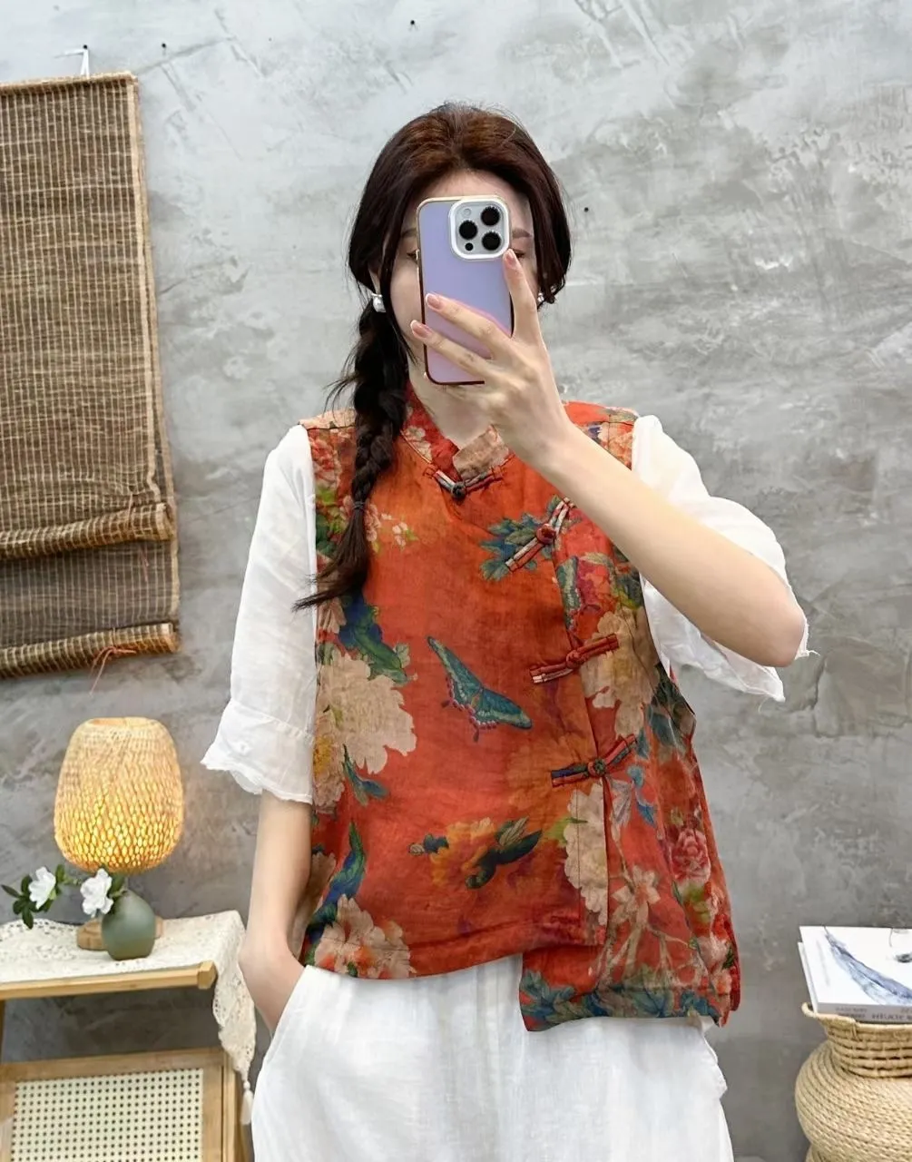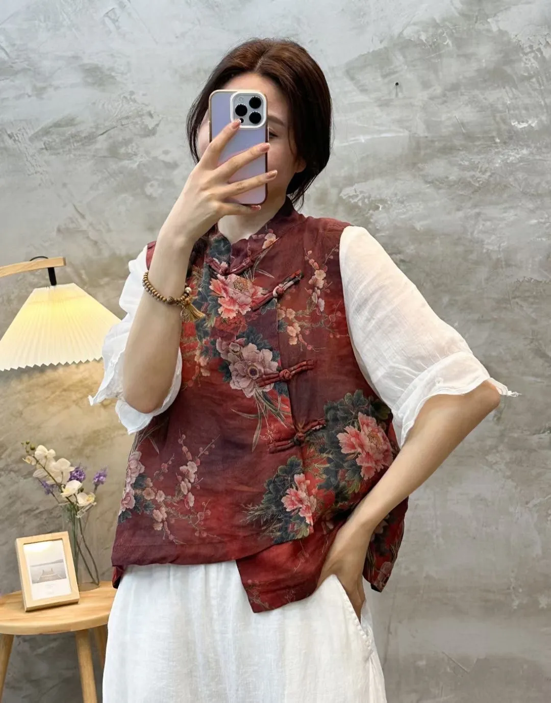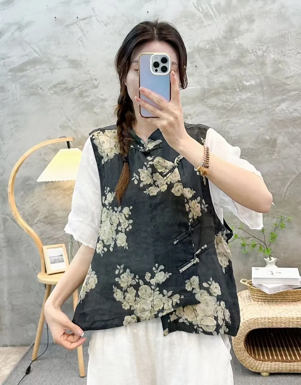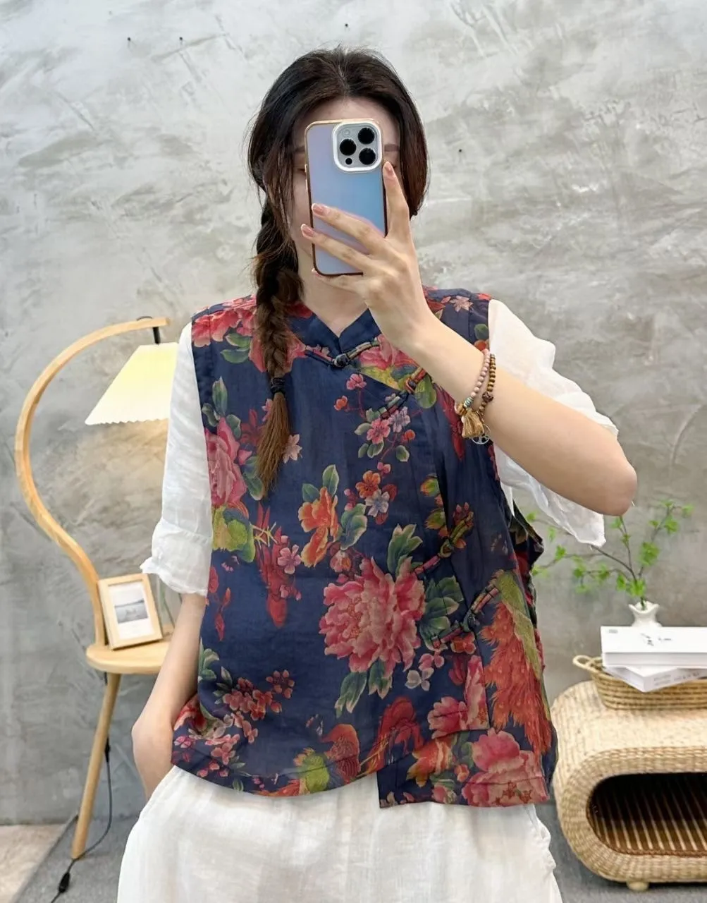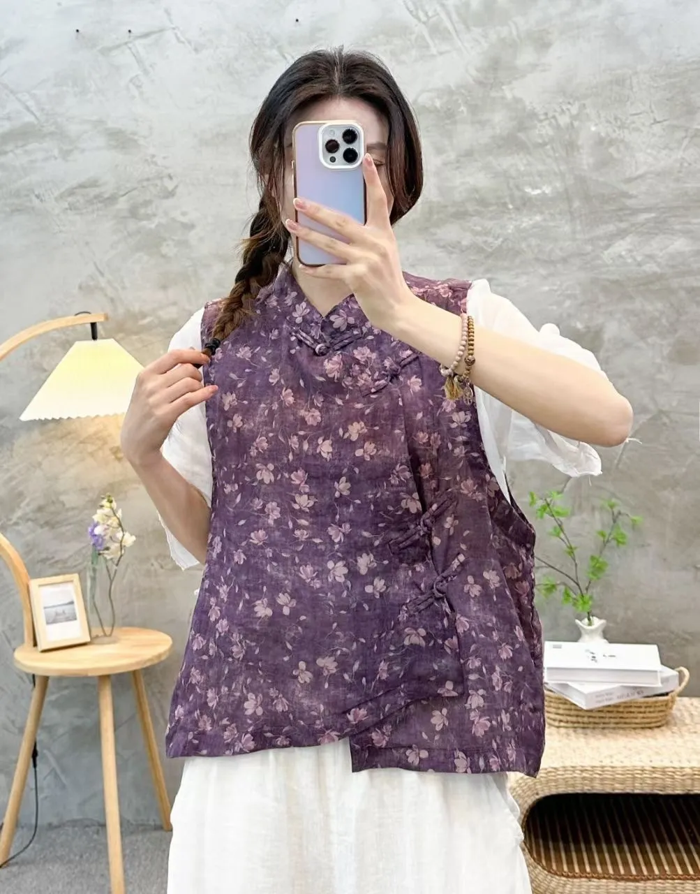 衣都精品- 新款民族風不規則印花立領盤扣開衫無袖上衣