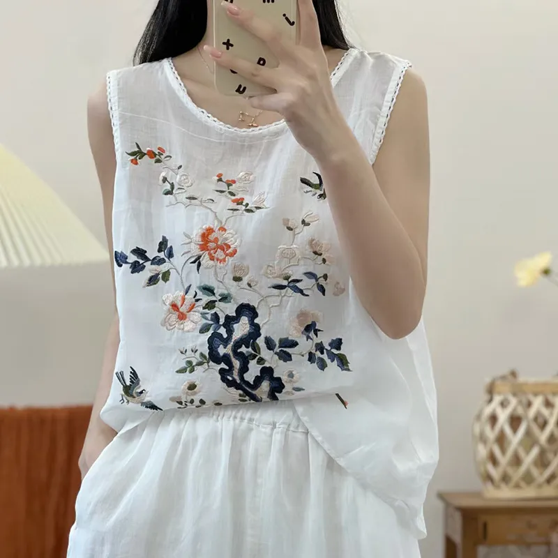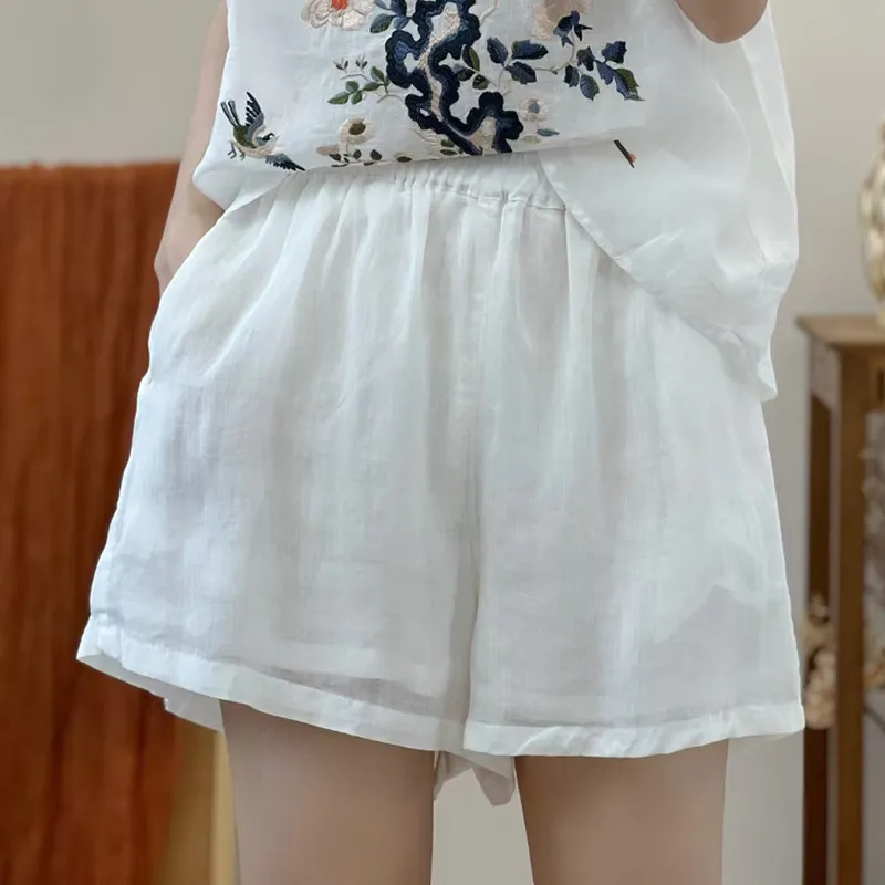 衣都精品- 新款無袖圓領純色刺繡背心+高腰顯瘦短褲2件套裝
