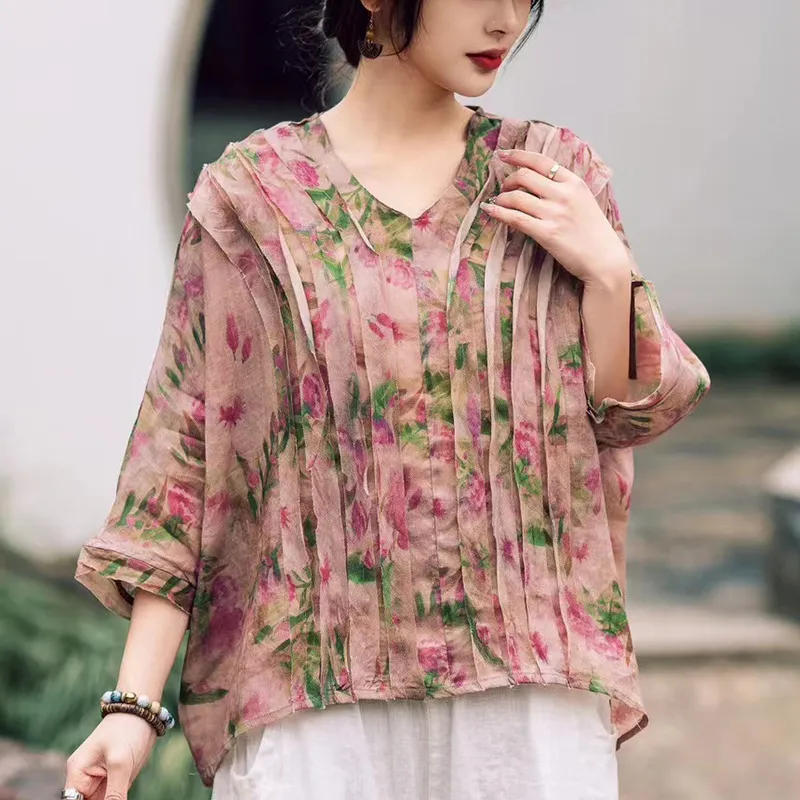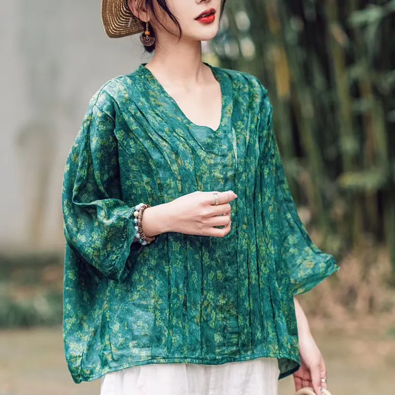 衣都精品- 新款民族風V領七分袖套頭簡約氣質上衣