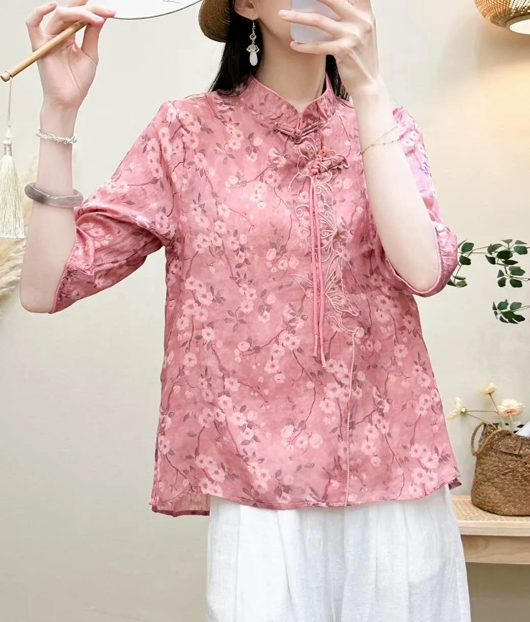 衣都精品- 新款印花斜襟盤扣立領五分袖上衣