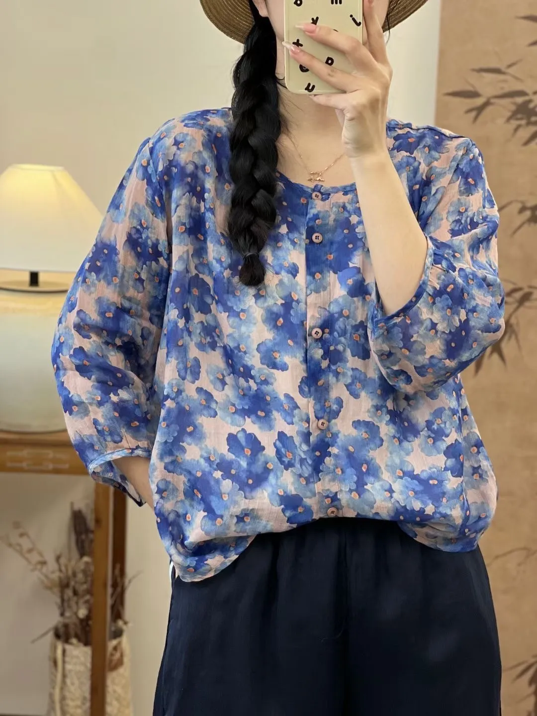 衣都精品- 新款復古立領盤扣寬鬆顯瘦印花上衣