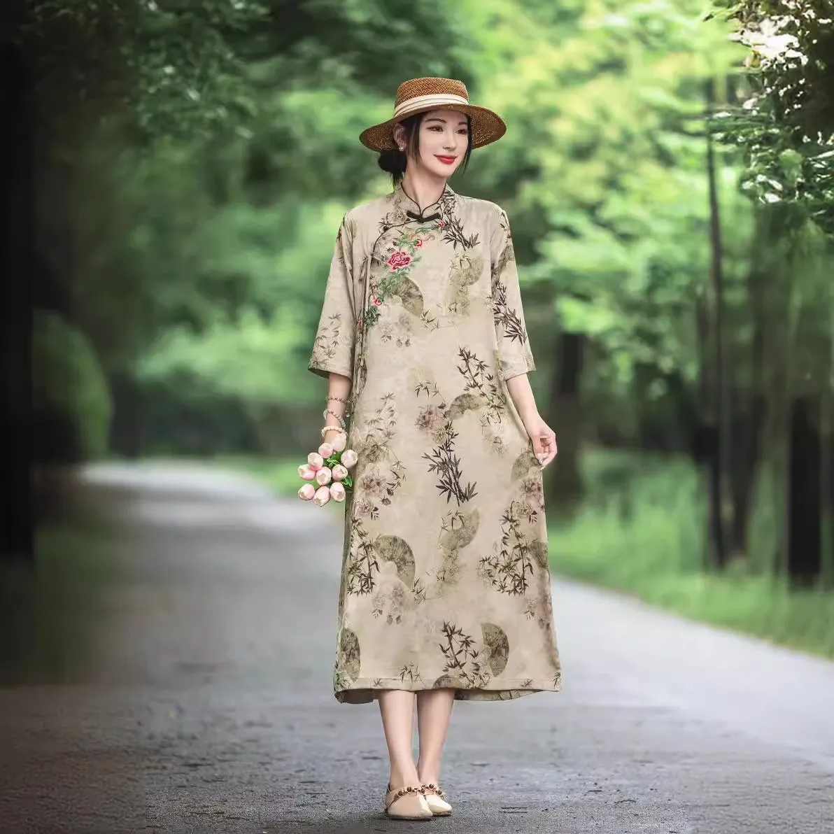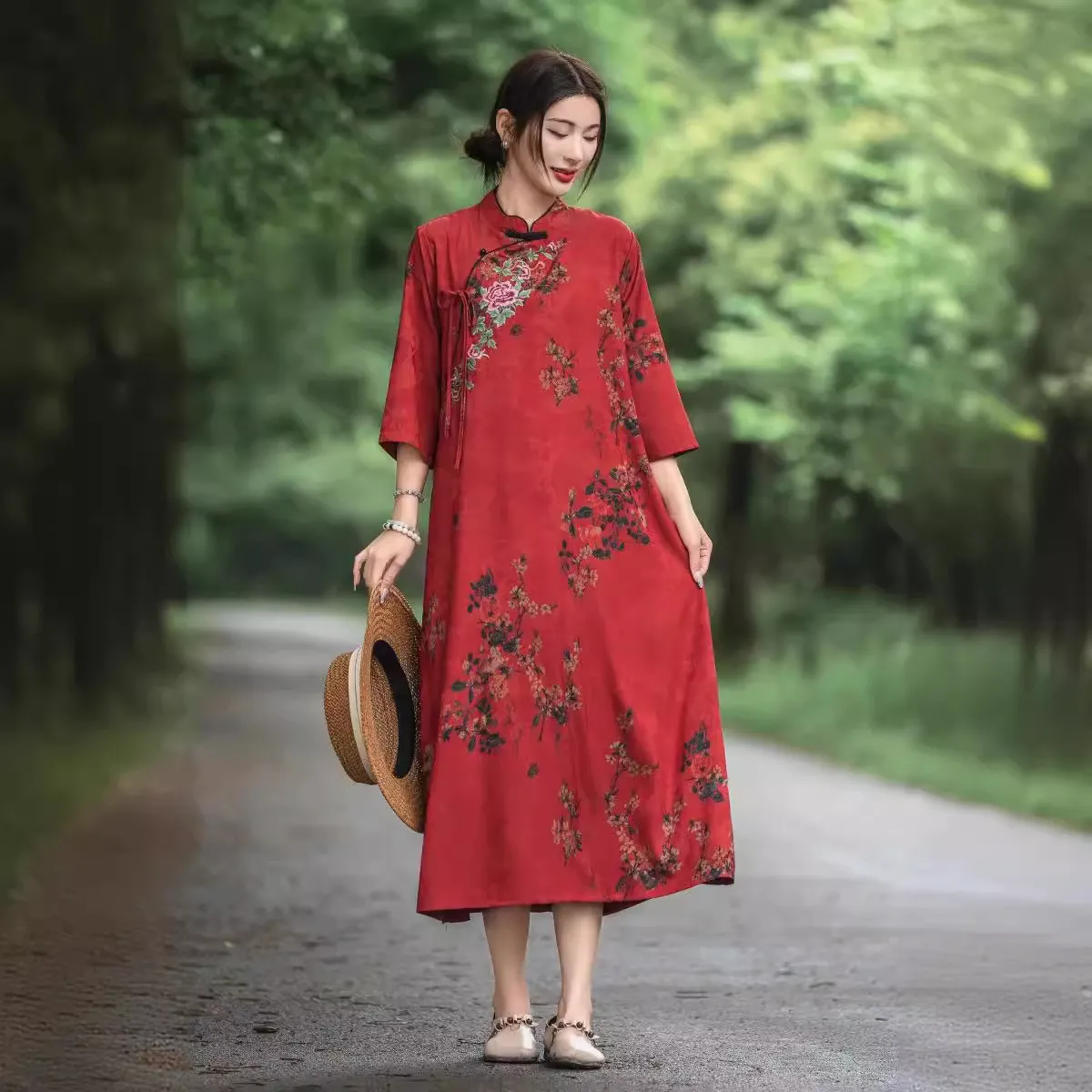 衣都精品- 新款民族風人絲緞面改良旗袍提花刺繡連衣裙