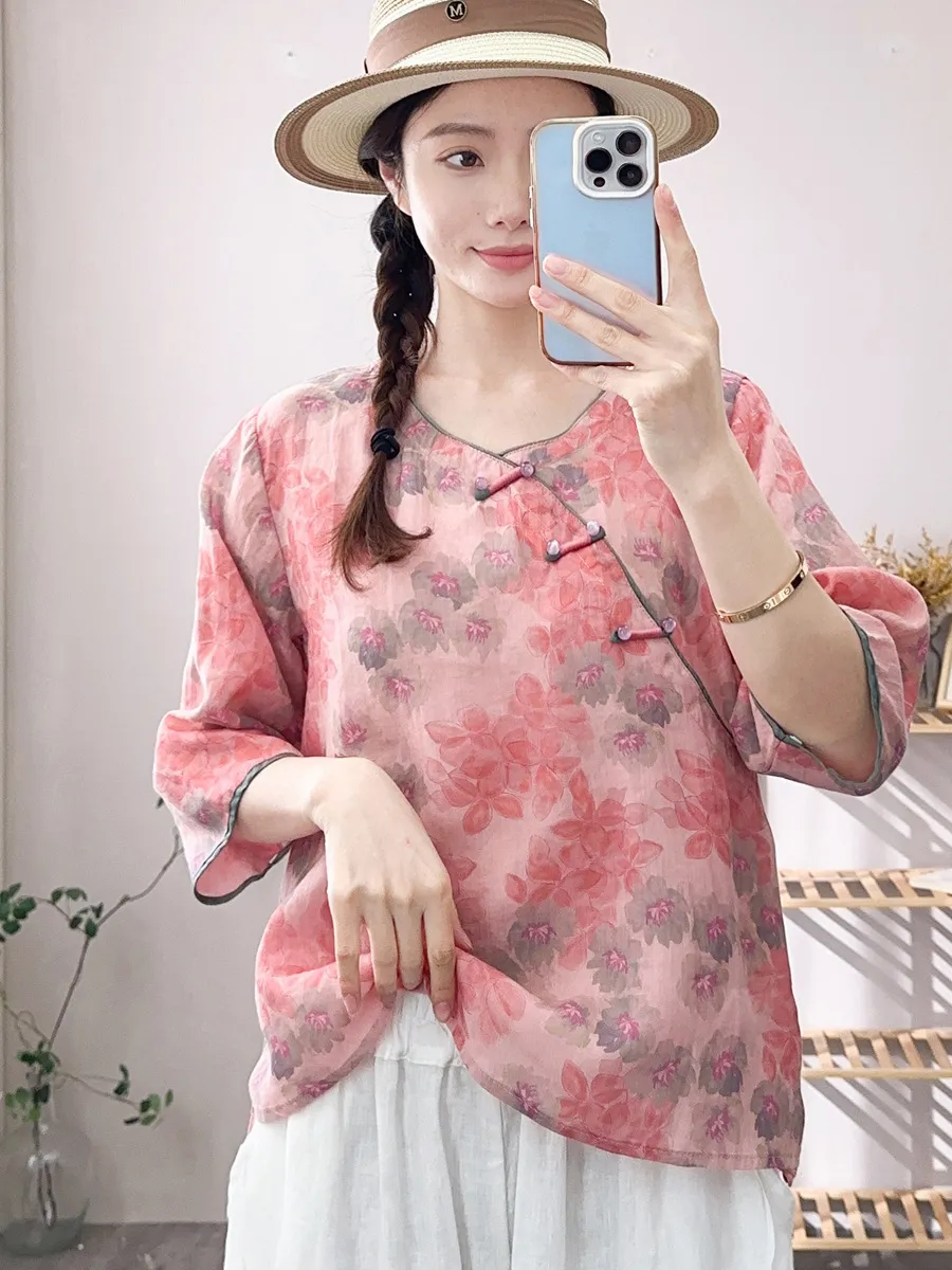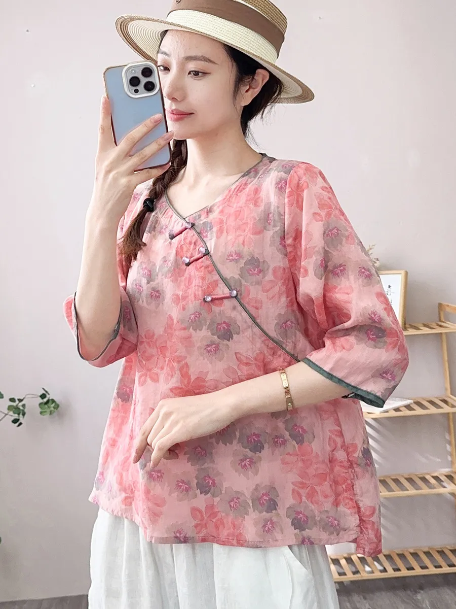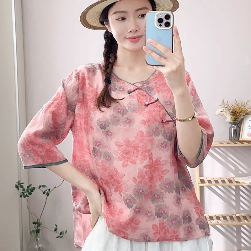 衣都精品- 新款復古碎花五分袖寬鬆盤扣大碼上衣