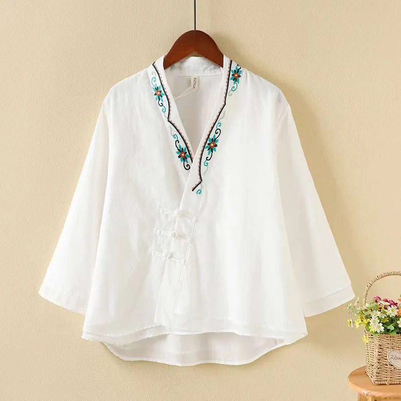 衣都精品- 新款民族風刺繡斜襟盤扣開襟七分袖上衣