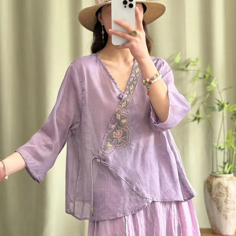 衣都精品- 新款民族風刺繡斜襟盤扣開襟七分袖上衣