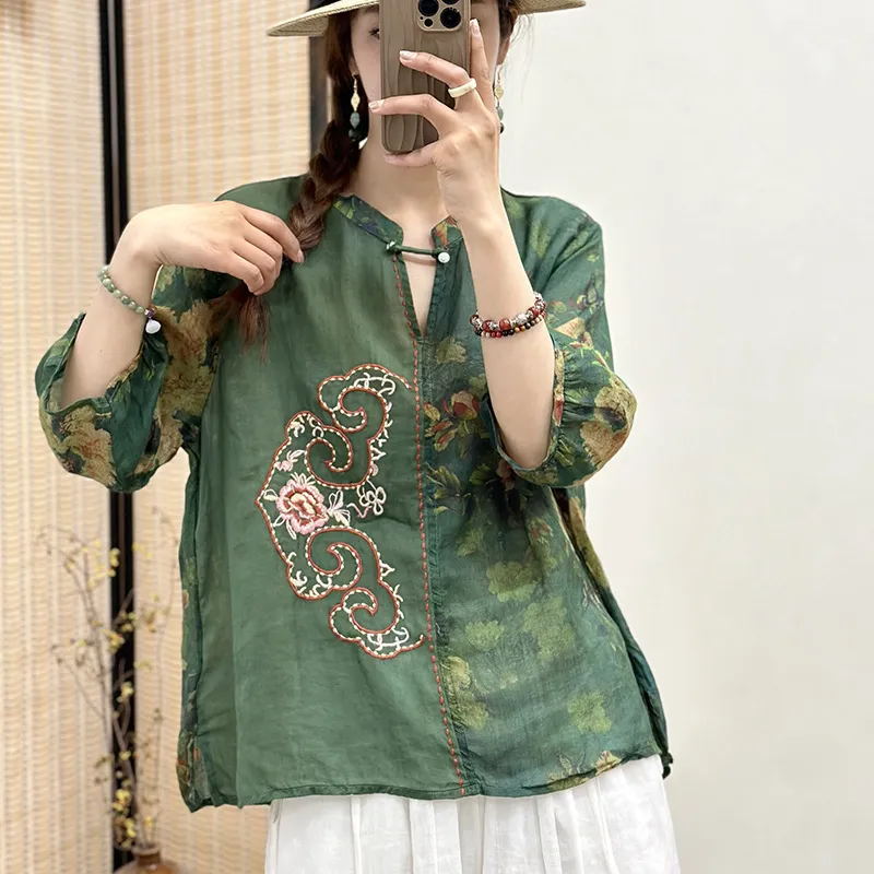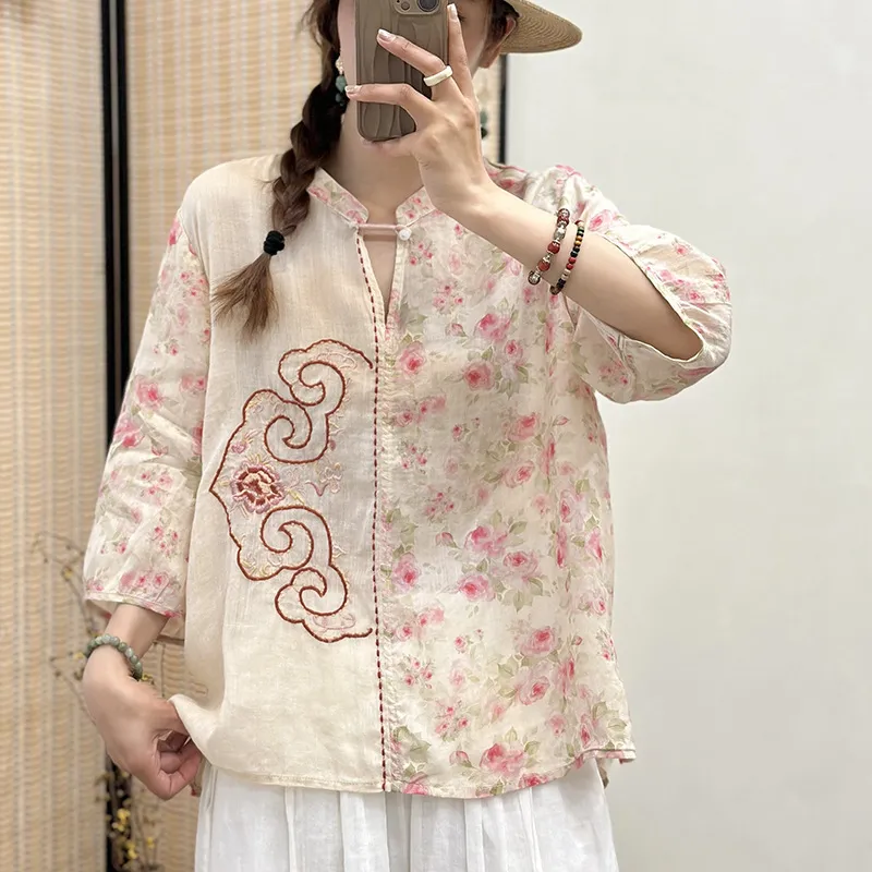 衣都精品- 新款民族風刺繡斜襟盤扣開襟七分袖上衣