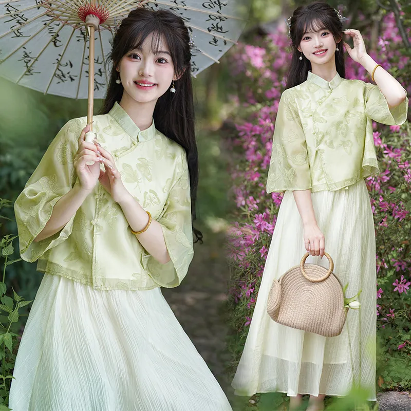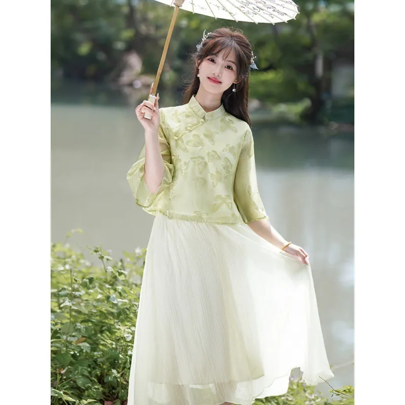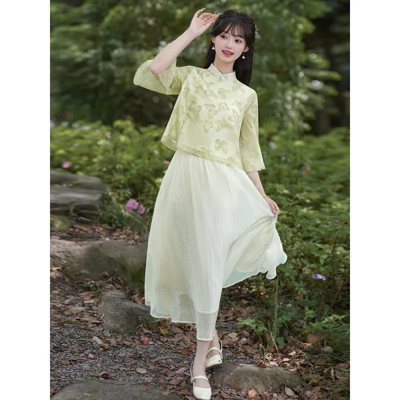 衣都精品- 新款中式改良唐裝立體植絨七分袖盤扣上衣+半身裙套裝