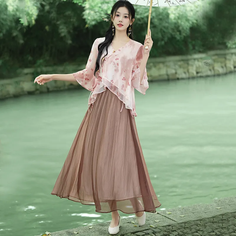 衣都精品- 新款中式改良唐裝立體植絨七分袖盤扣上衣+半身裙套裝
