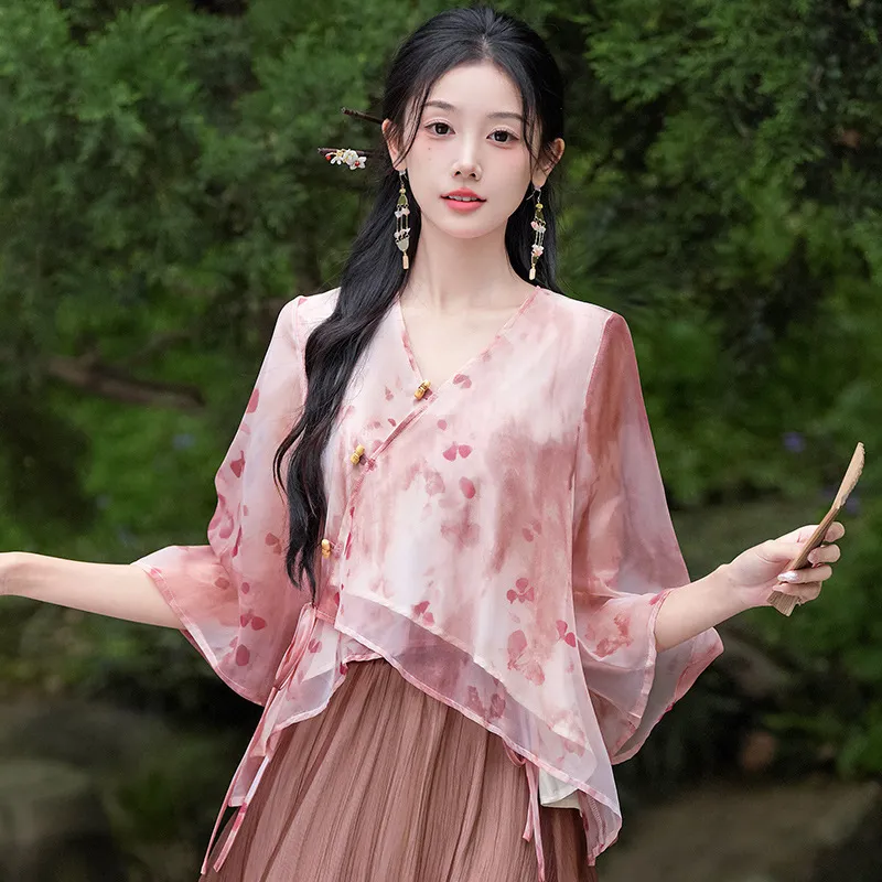 衣都精品- 新款中袖斜襟V領盤扣繫帶復古印花上衣