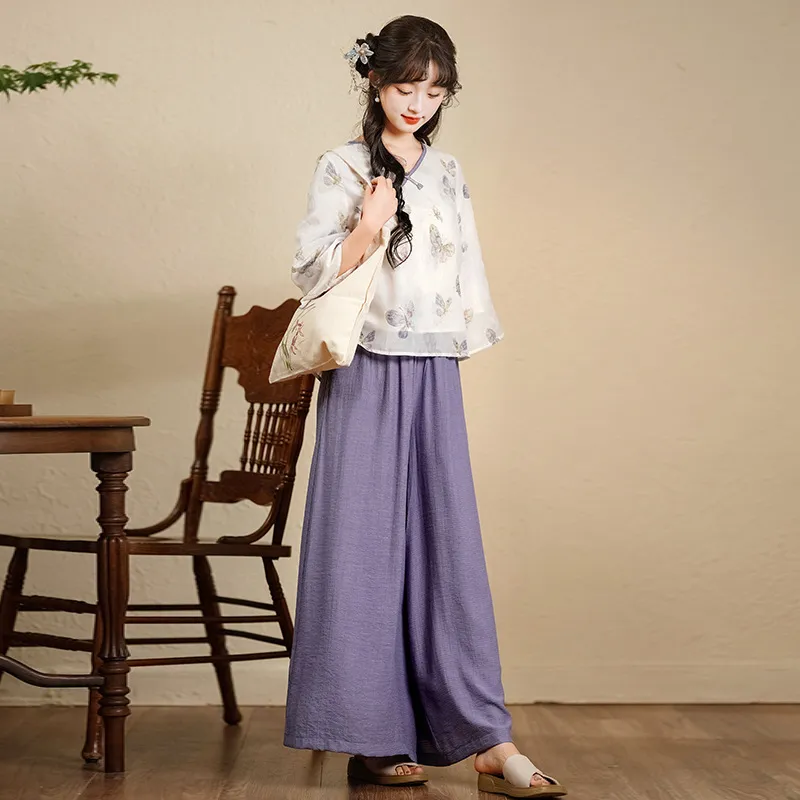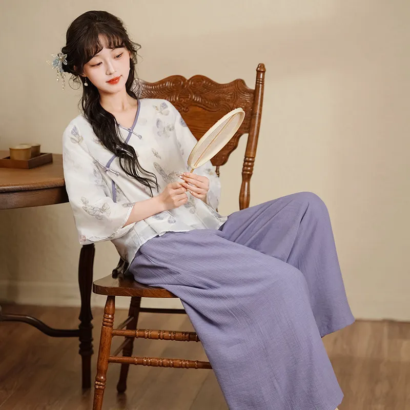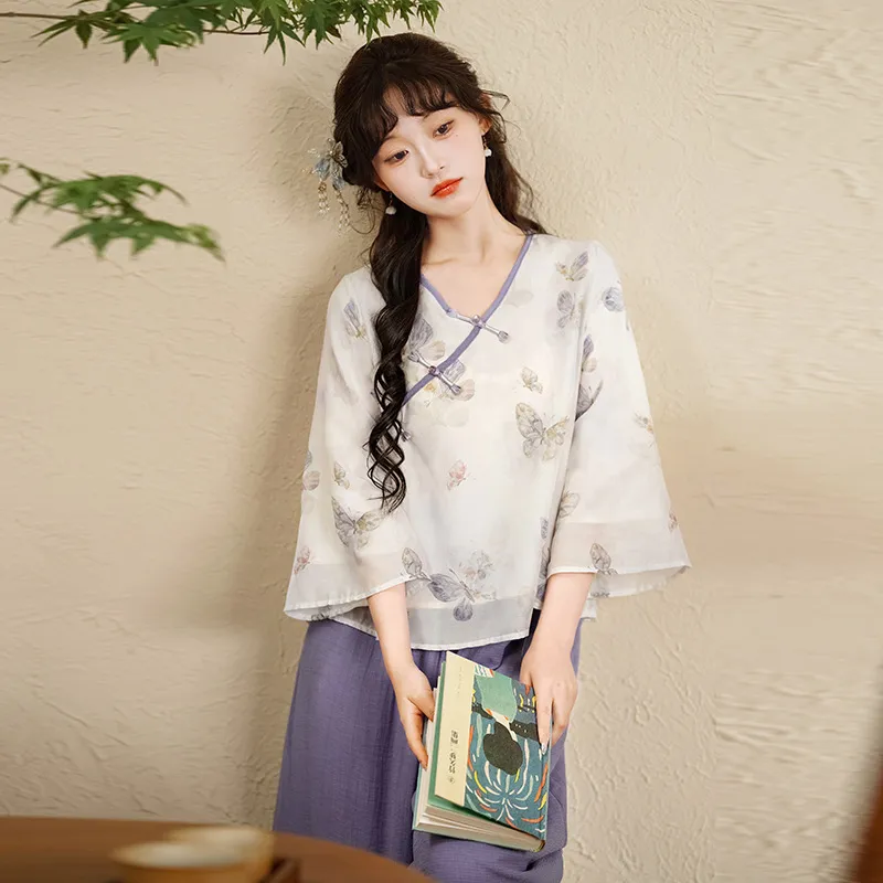 衣都精品- 新款中國風交領盤扣印花七分袖上衣