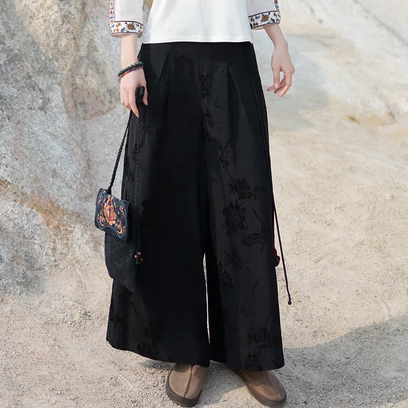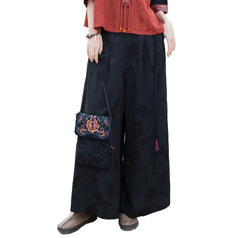衣都精品- 新款民族風緞面提花手工花朵裝飾闊腿褲