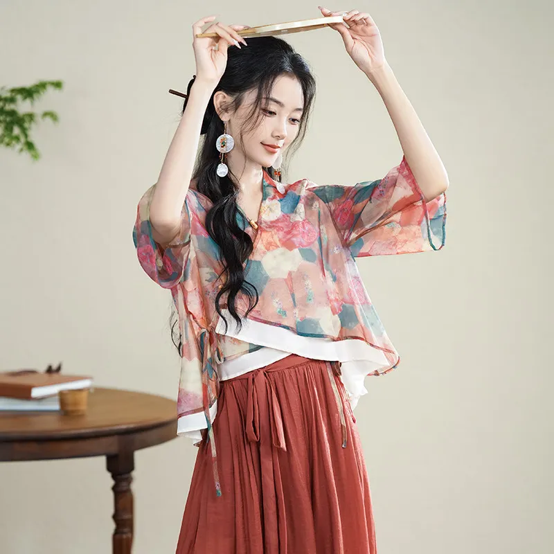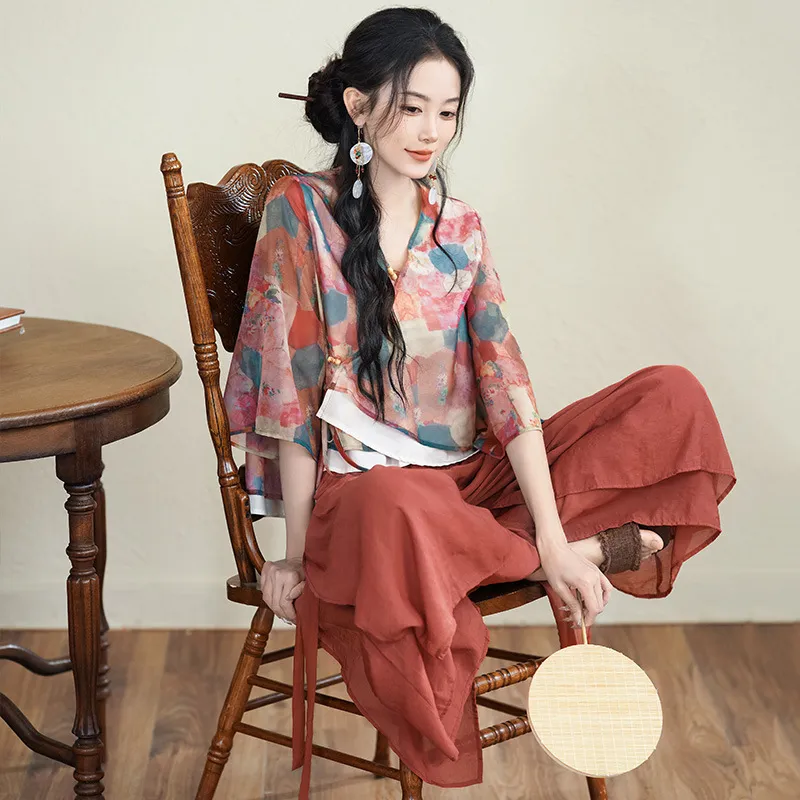 衣都精品- 新款中國風交領盤扣印花七分袖上衣