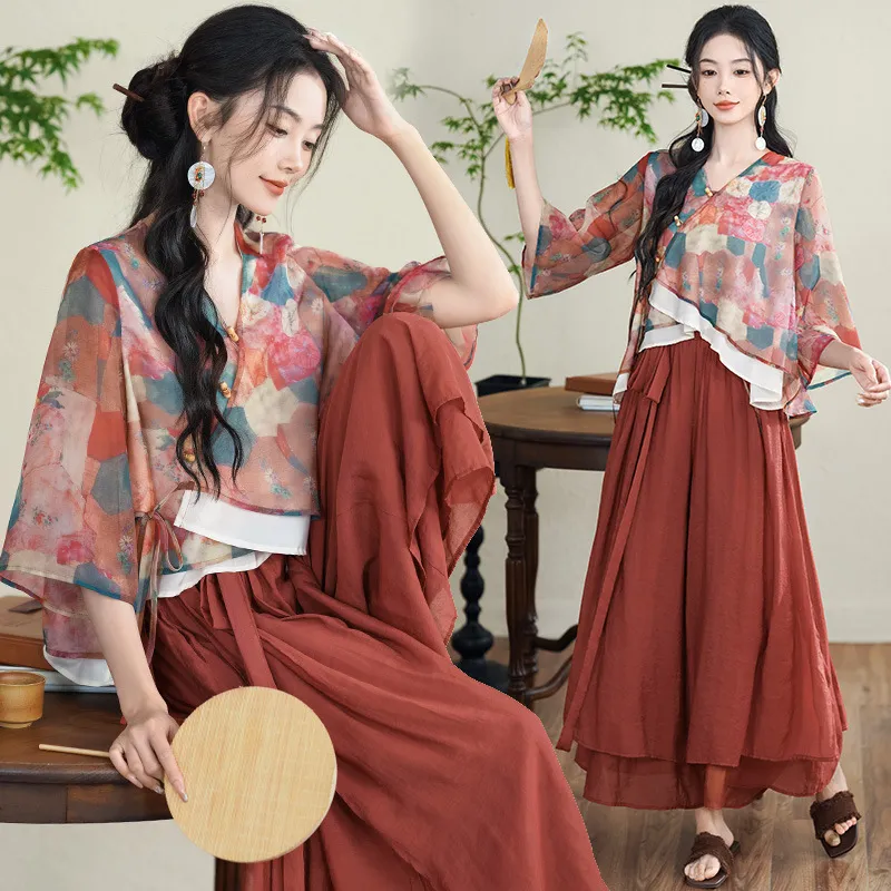 衣都精品- 新款復古盤扣斜襟V領改良花色上衣