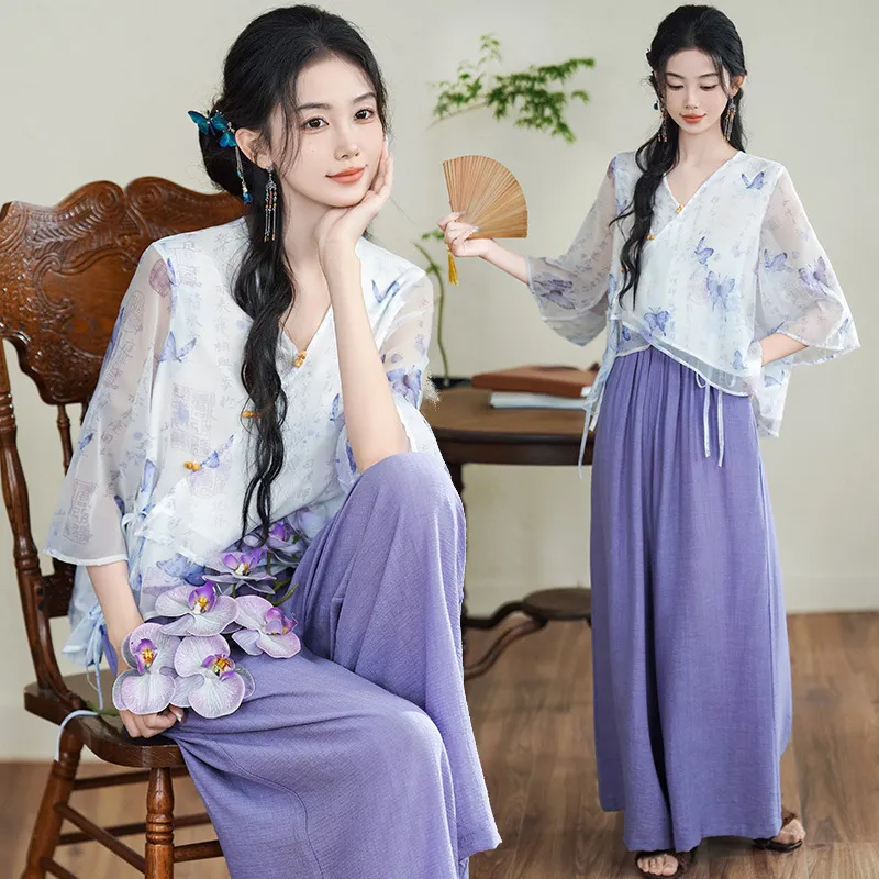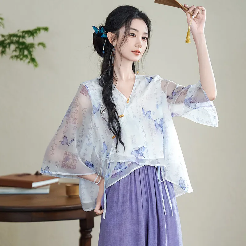 衣都精品- 新款復古盤扣斜襟V領改良花色上衣