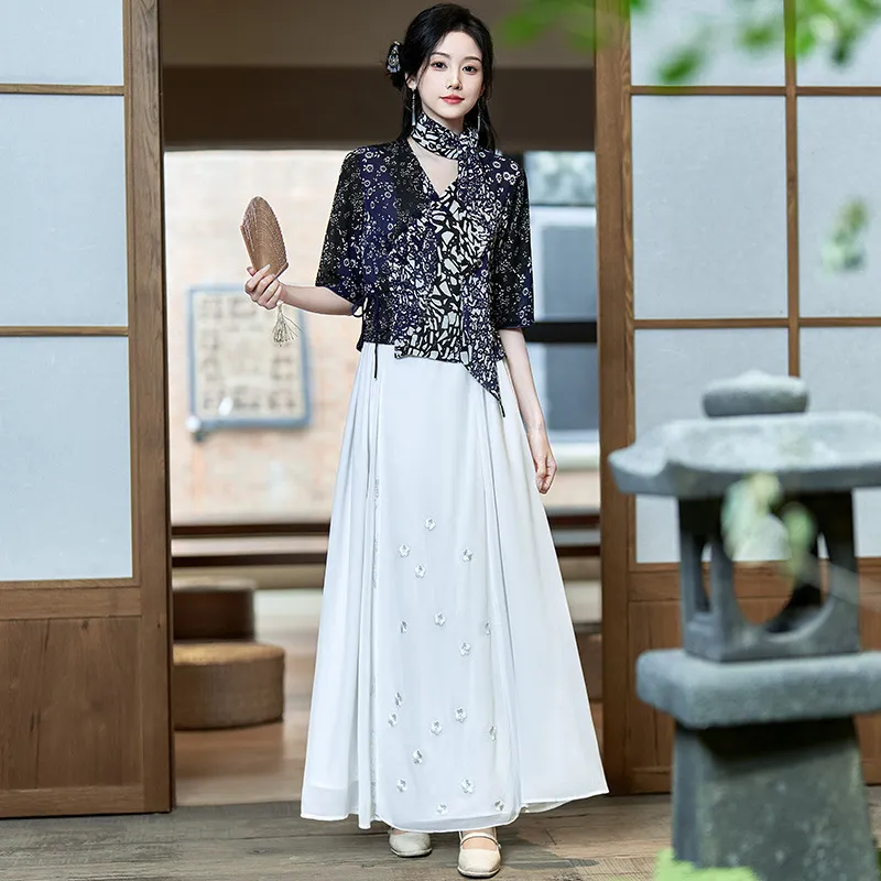 衣都精品- 新款中式立領斜襟盤扣改良復古上衣+拼接半身裙套裝