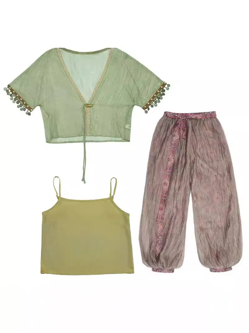 衣都精品- 新款復古吊帶+V領開衫上衣+改良拼色燈籠褲三件式套裝