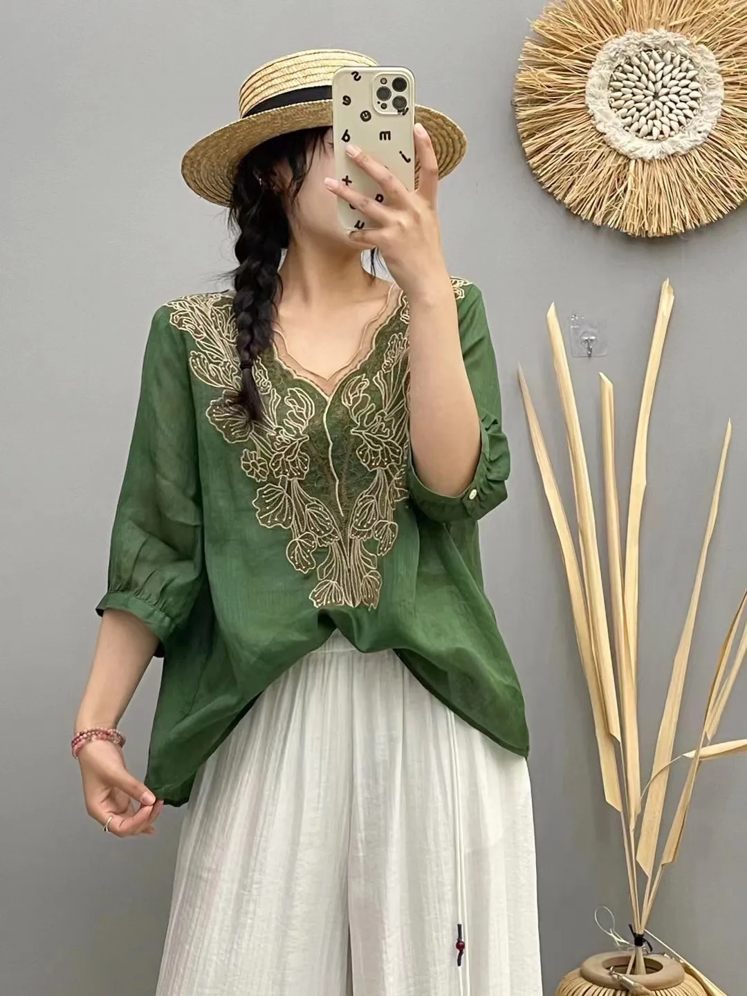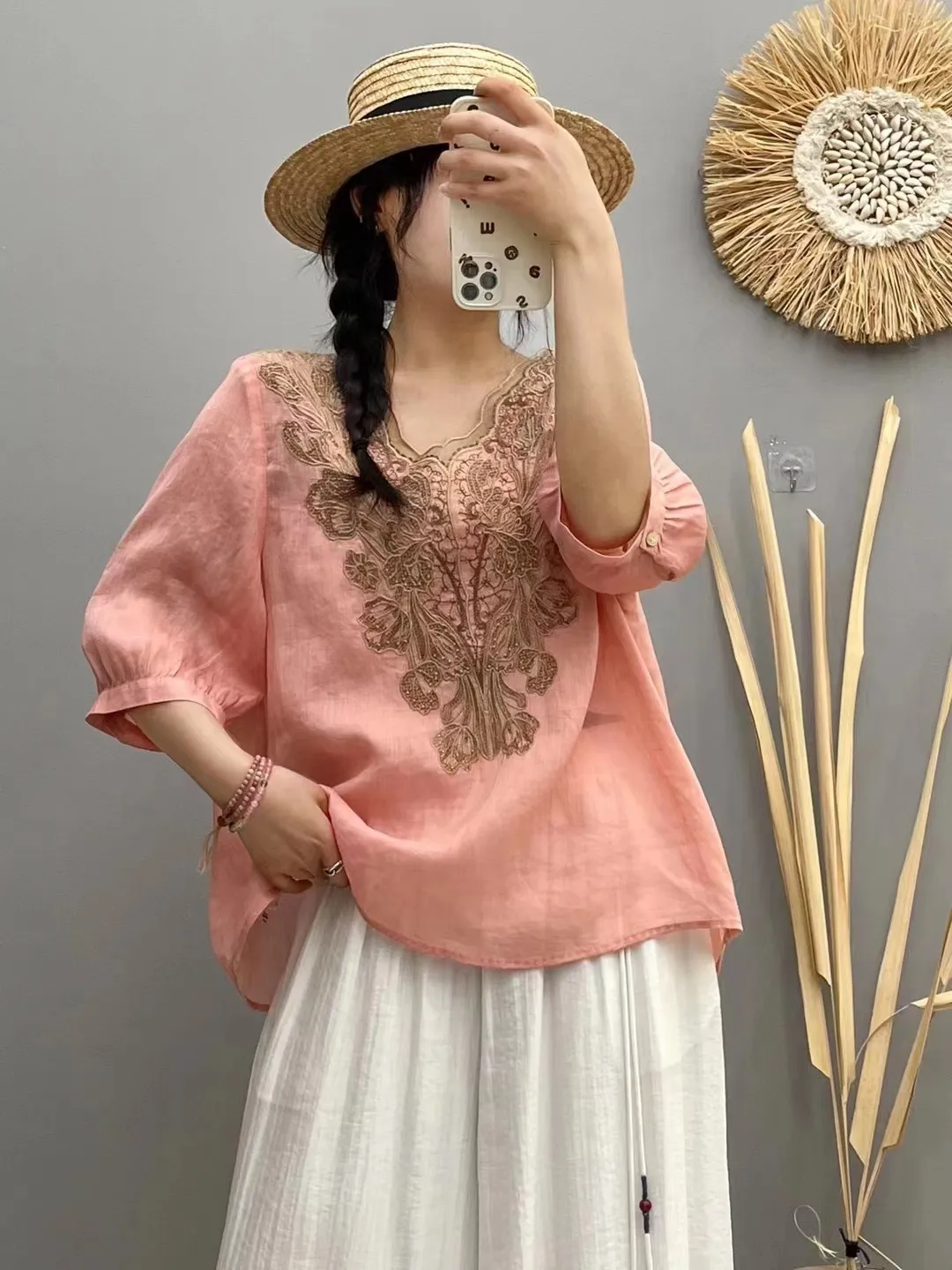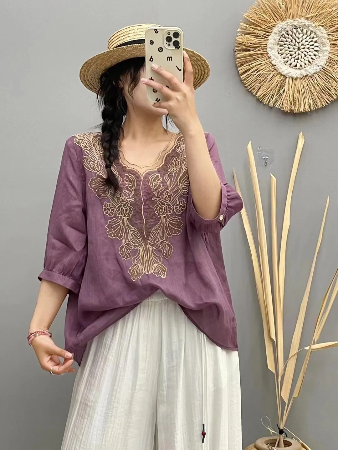 衣都精品- 新款山居刺繡斜襟繫繩七分袖寬鬆上衣