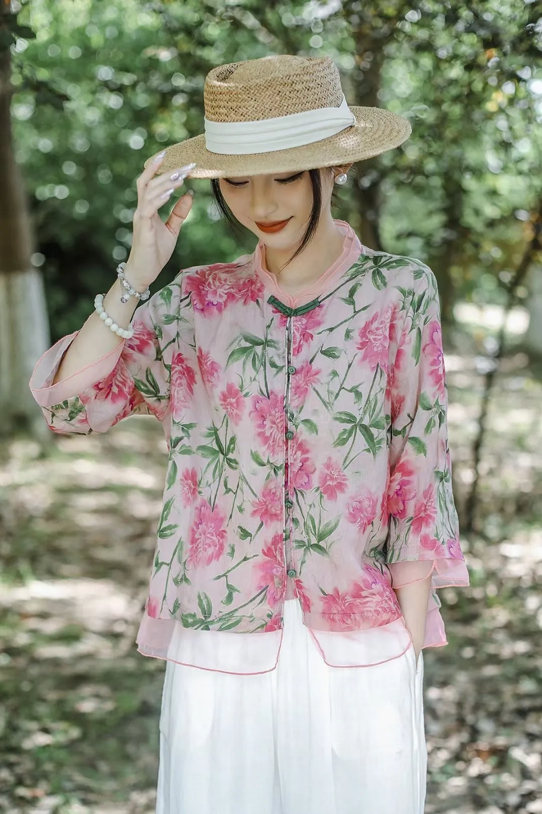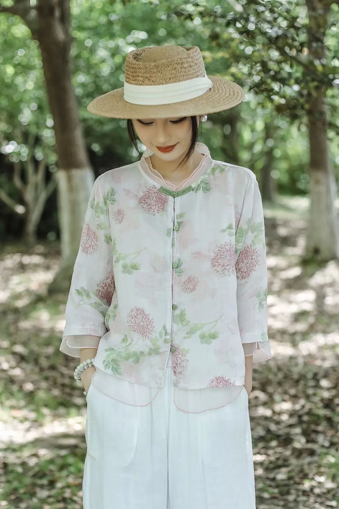 衣都精品- 新款數位印花中式領口盤扣刺繡中長款上衣