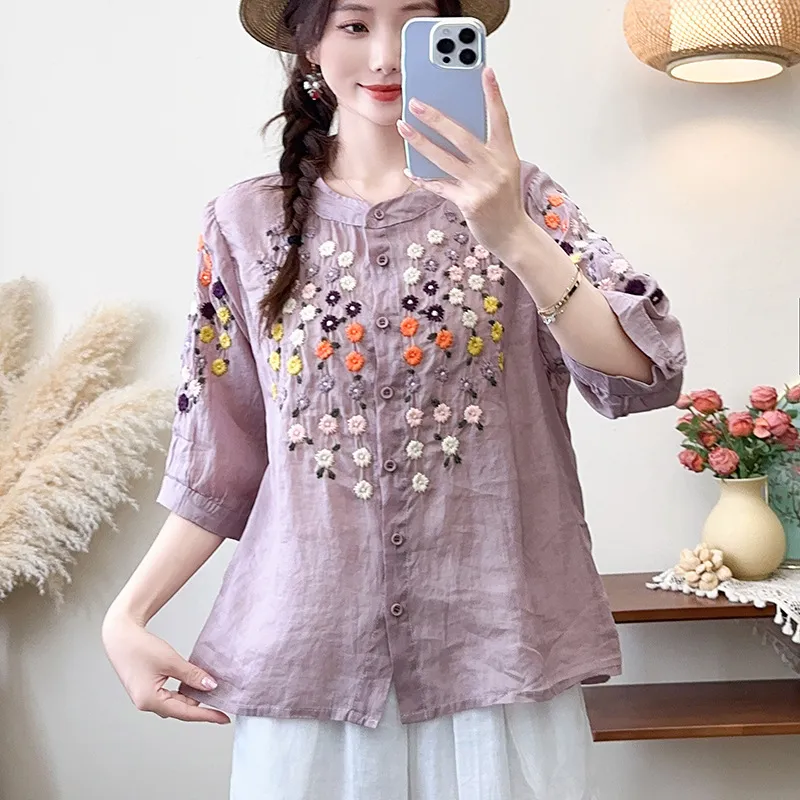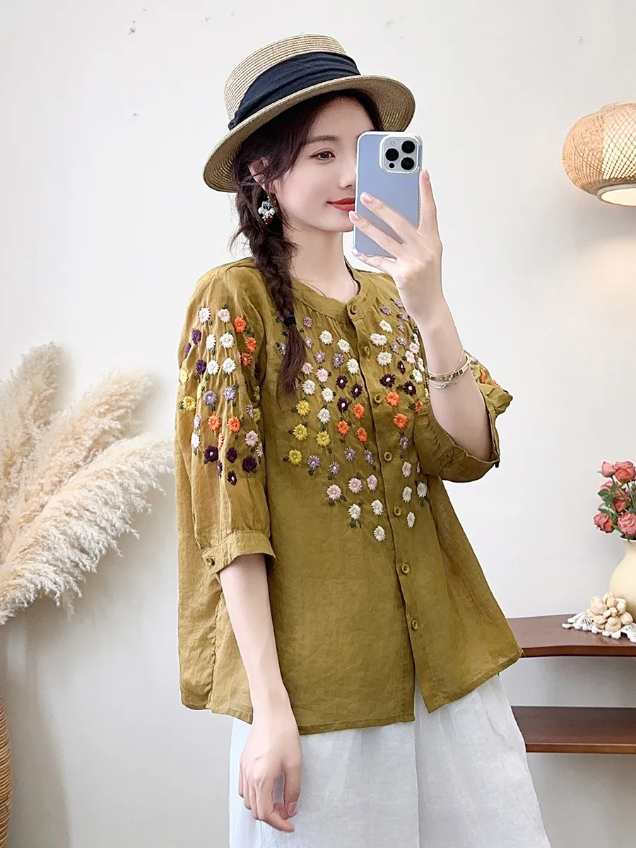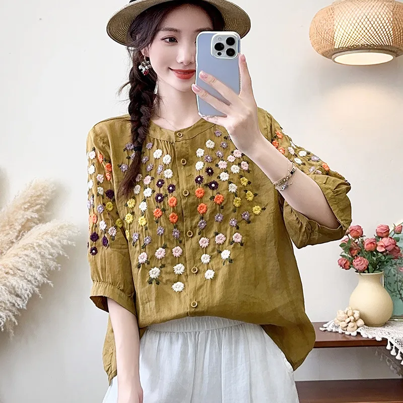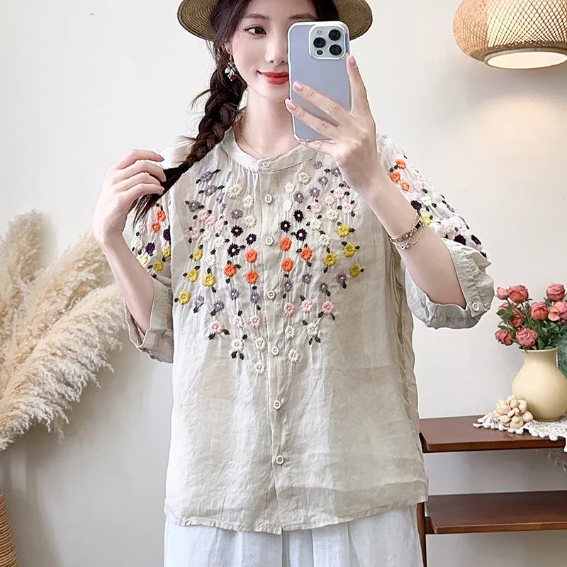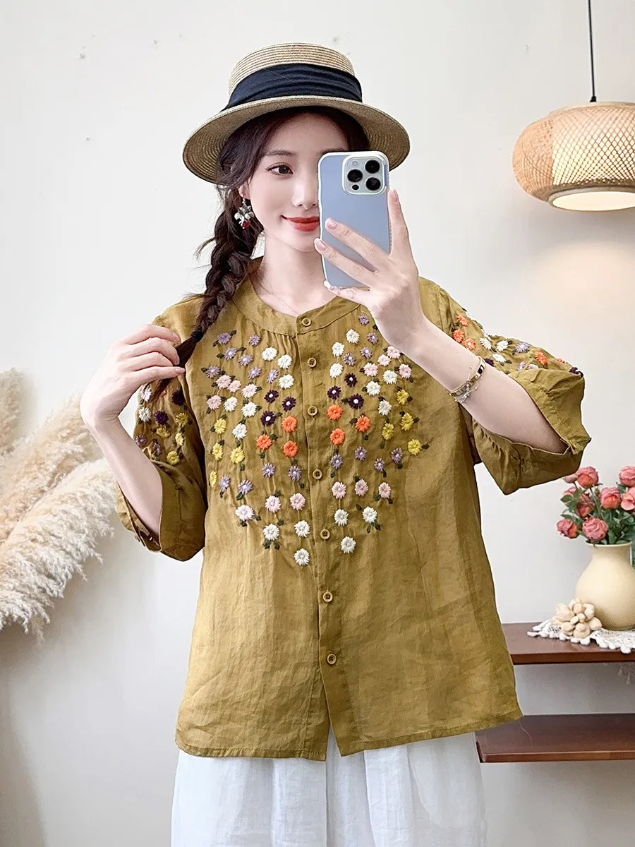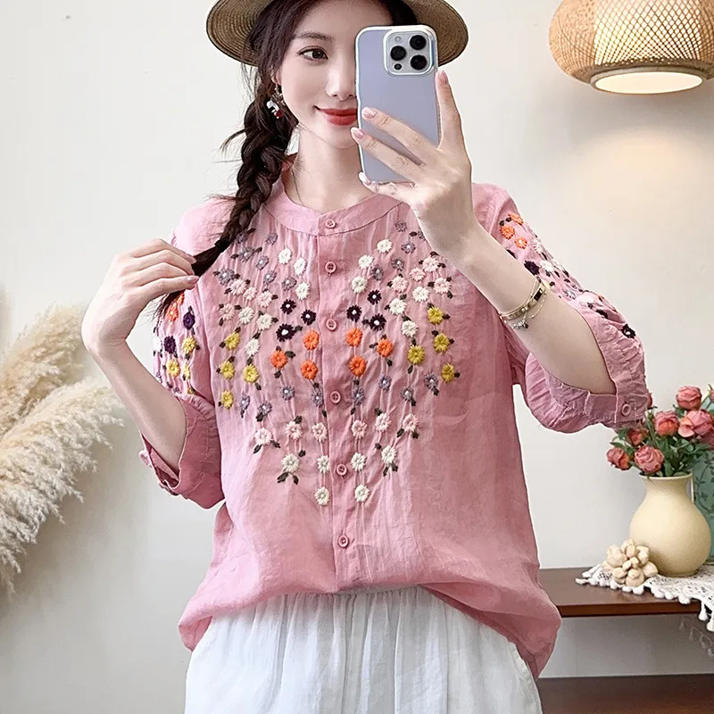 衣都精品- 新款雛菊刺繡立領中袖寬鬆文藝上衣