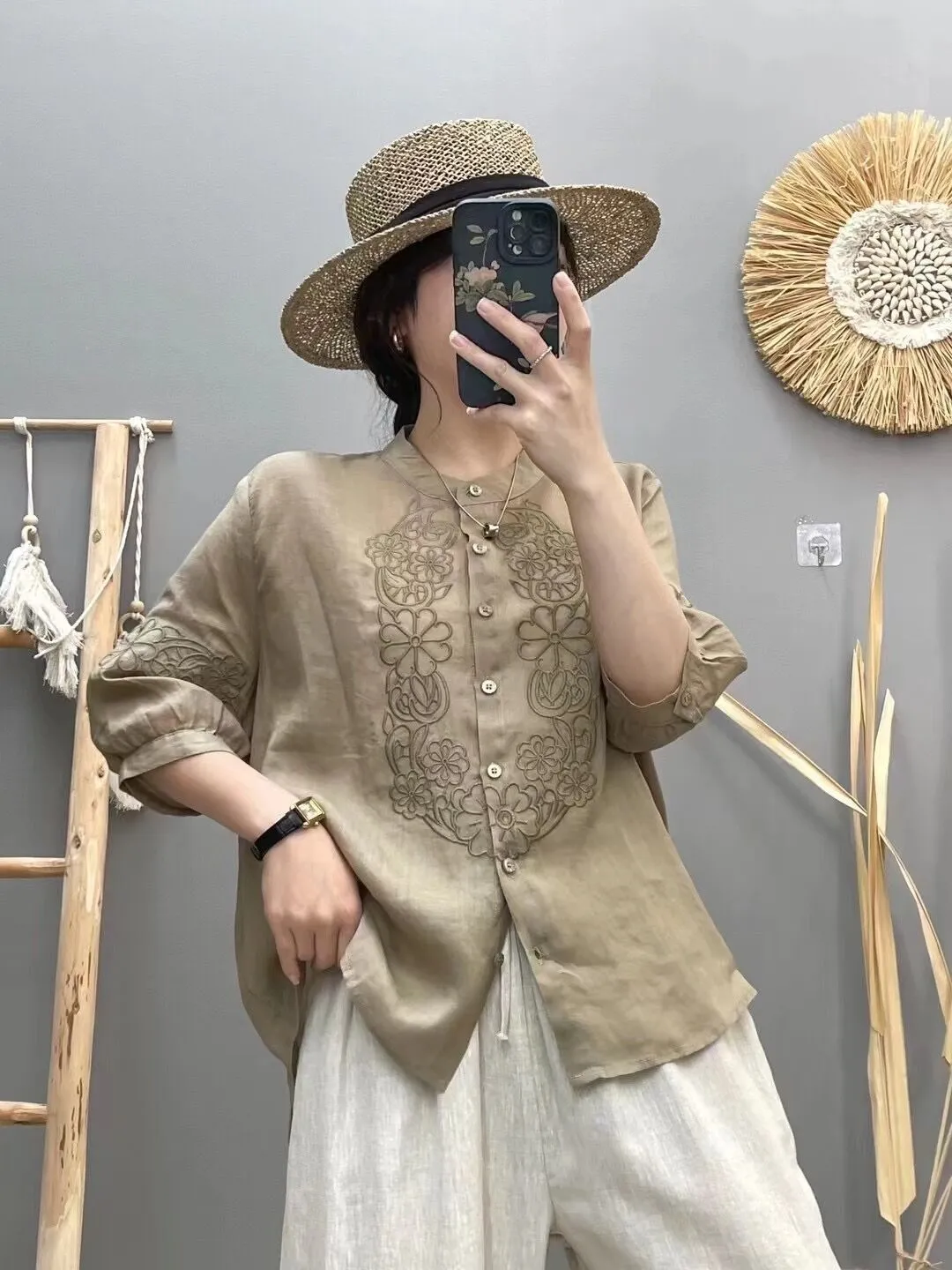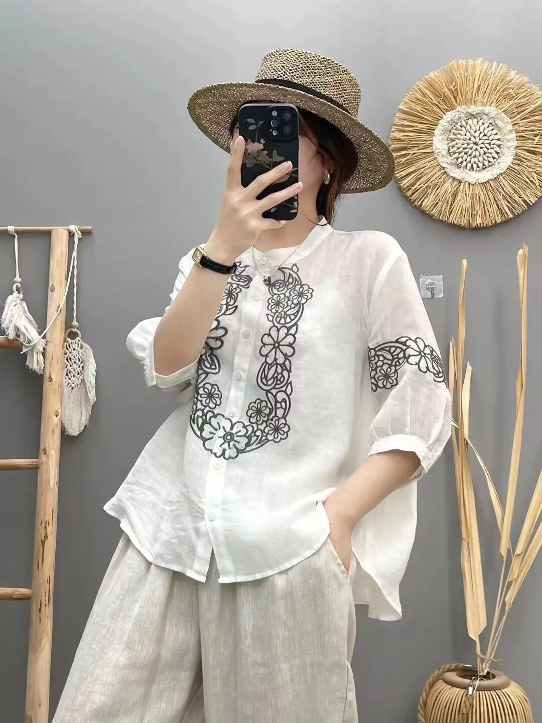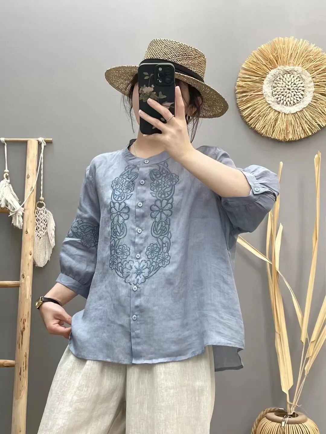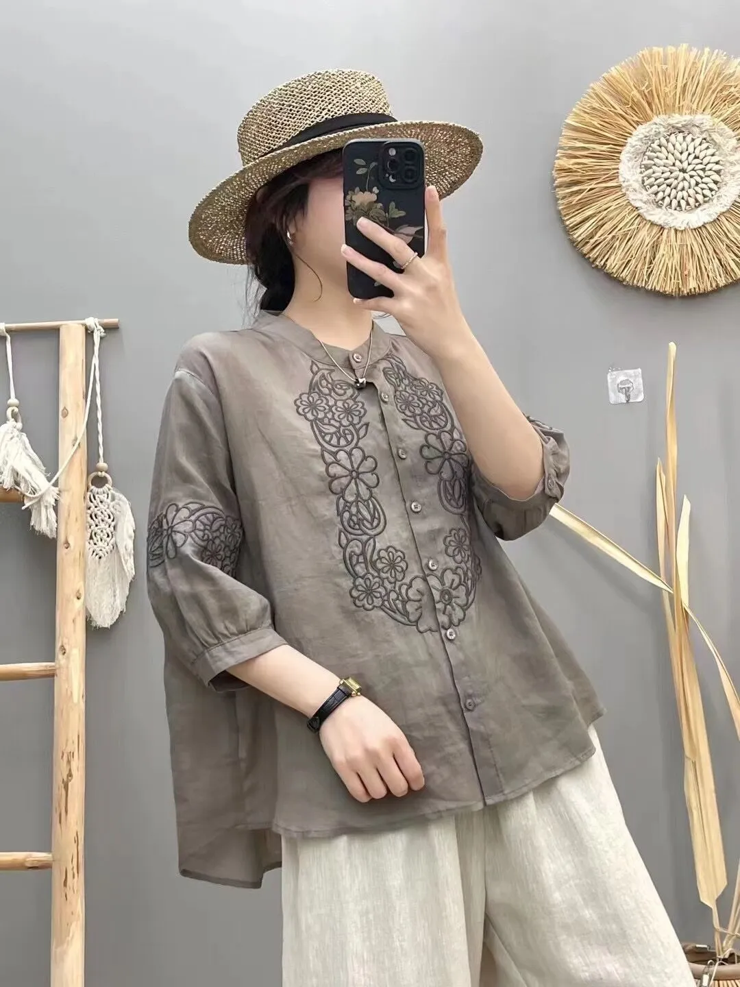 衣都精品- 新款雛菊刺繡立領中袖寬鬆文藝上衣
