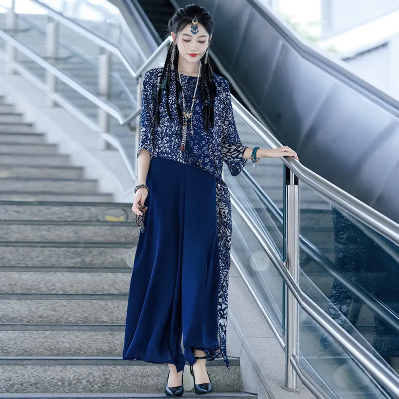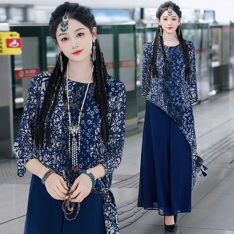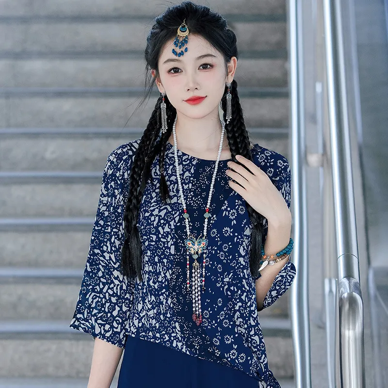 衣都精品- 新款民族風顯瘦斜襟V領寬鬆茶服+半身裙套裝
