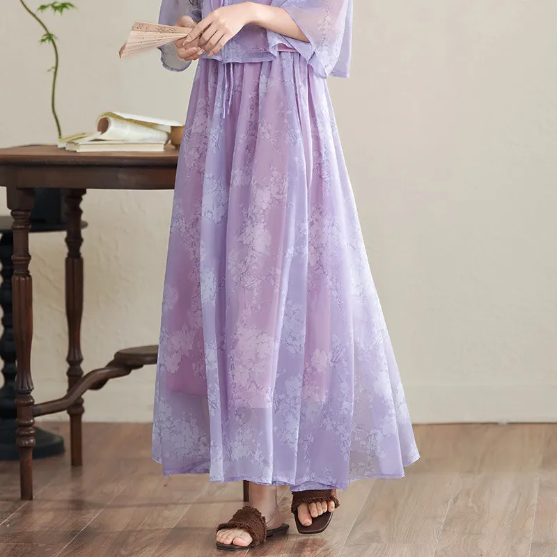 衣都精品- 新款民族風顯瘦斜襟V領寬鬆茶服+半身裙套裝