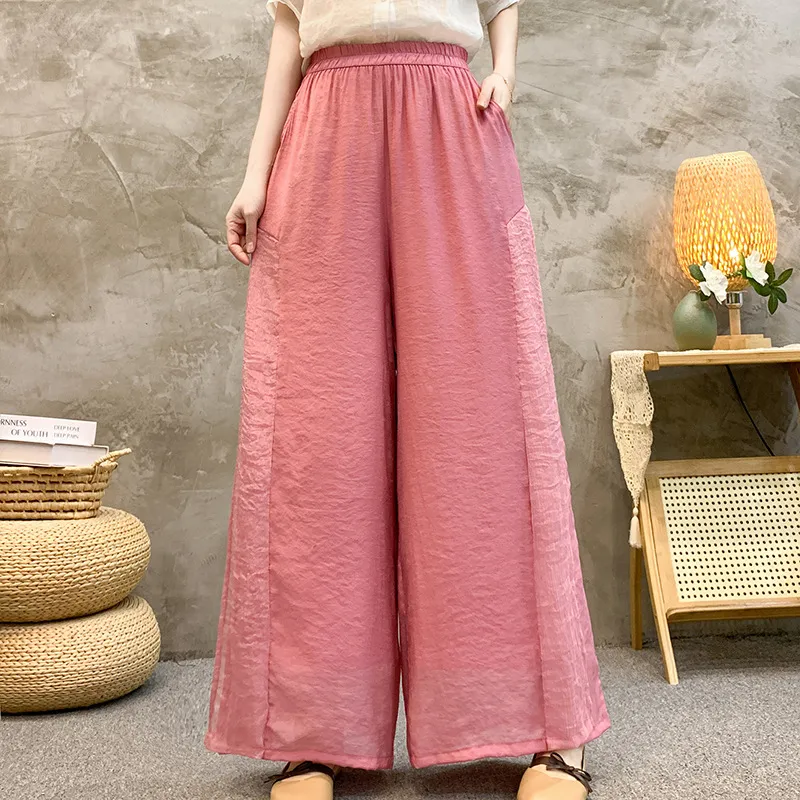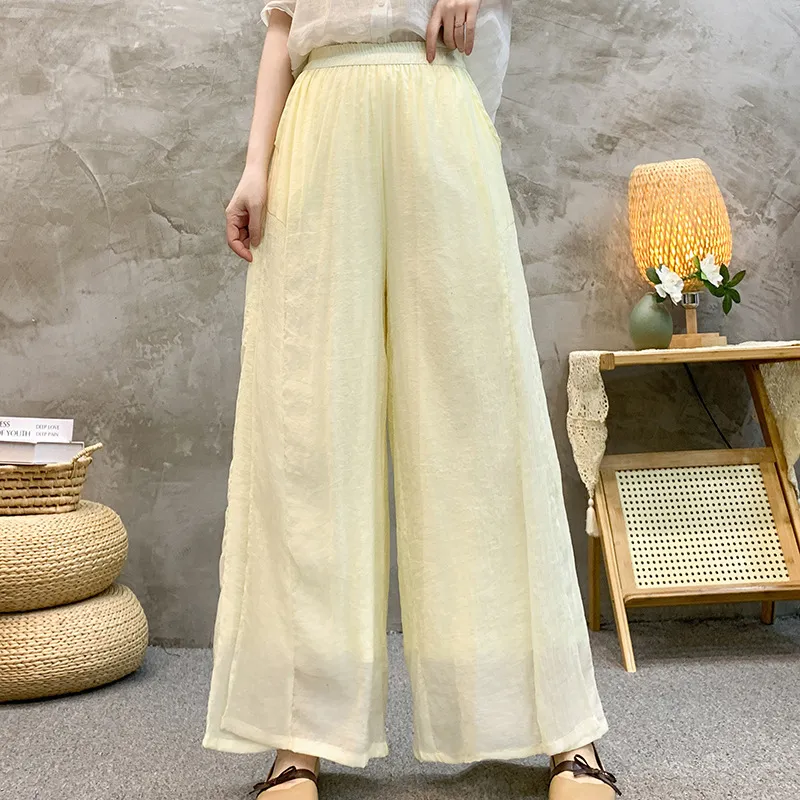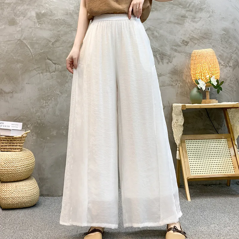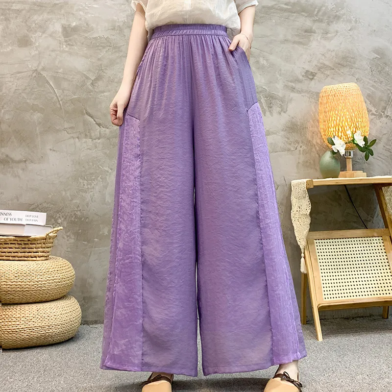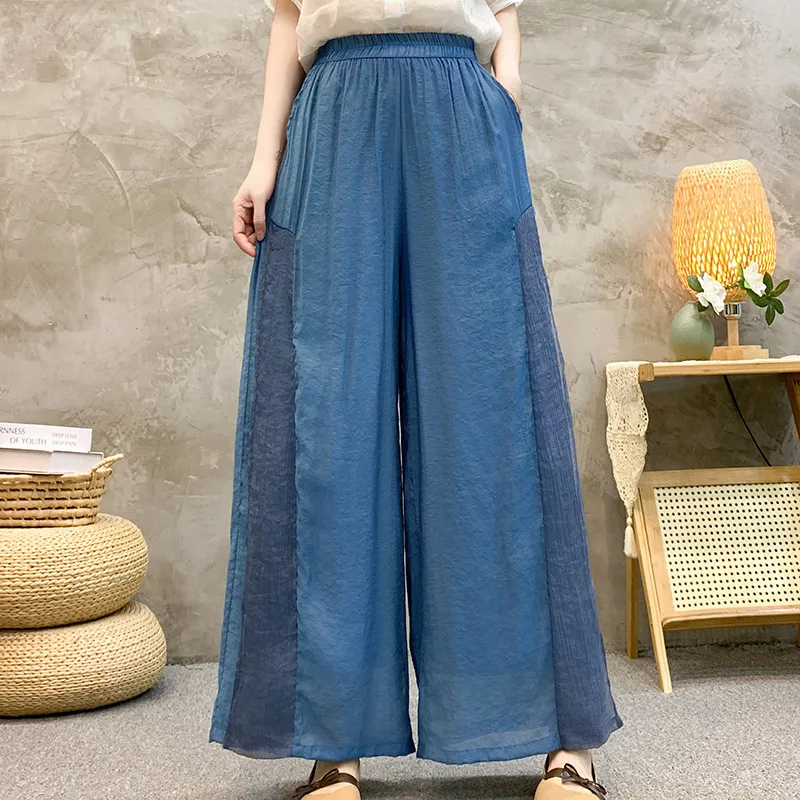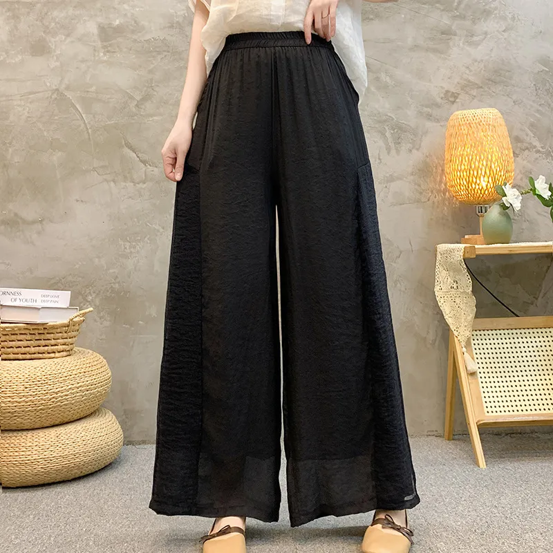 衣都精品- 新款純色拼接網紗寬鬆高腰文藝九分寬褲