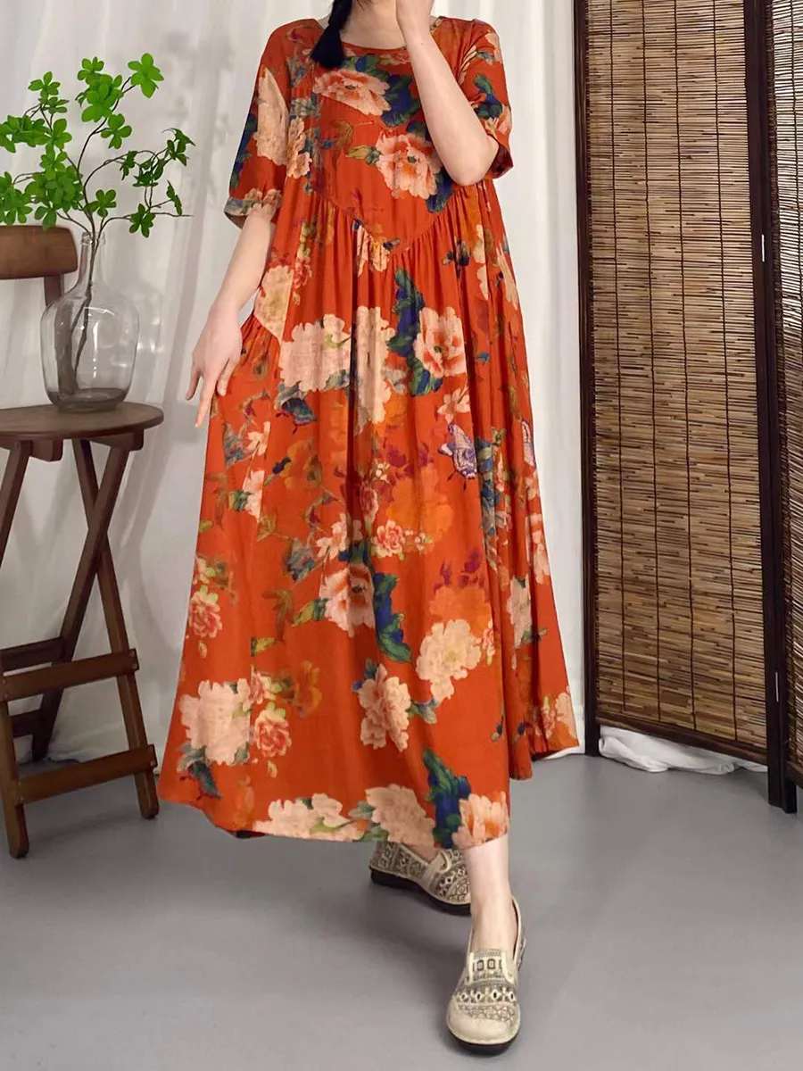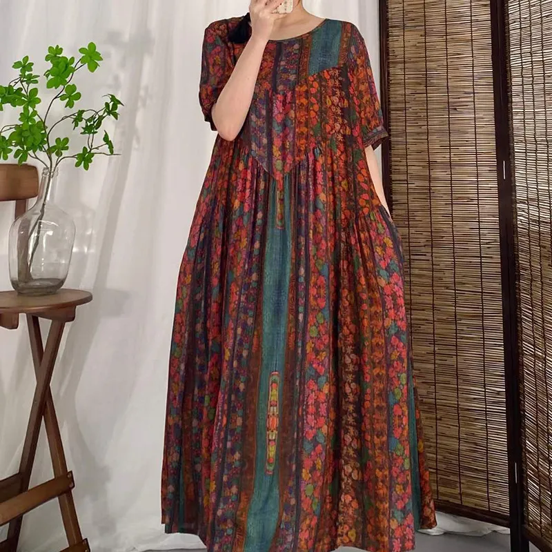 衣都精品- 新款文藝碎花短袖拼接寬鬆數位印花連衣裙