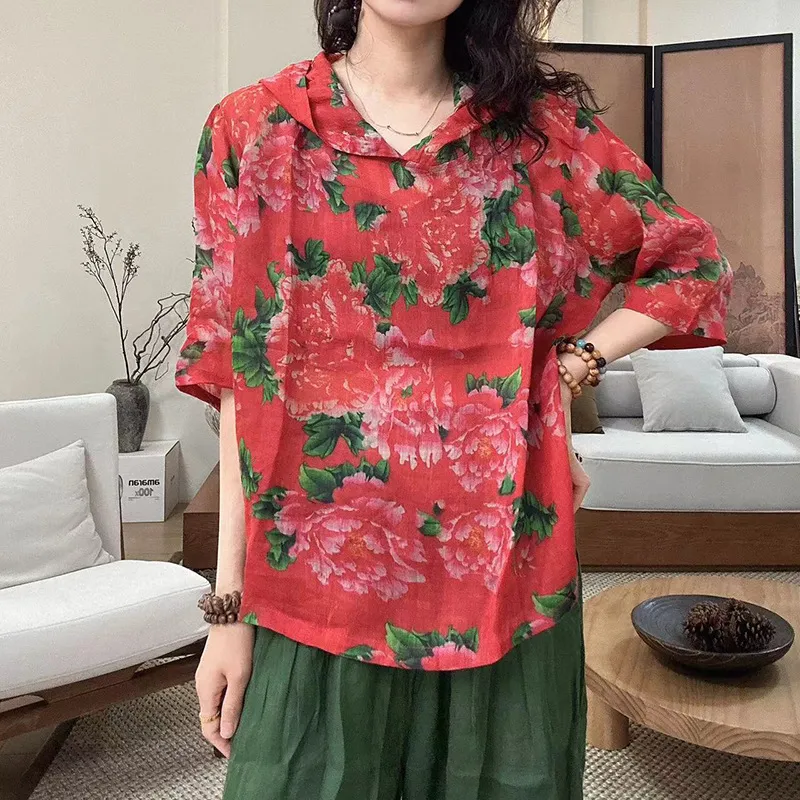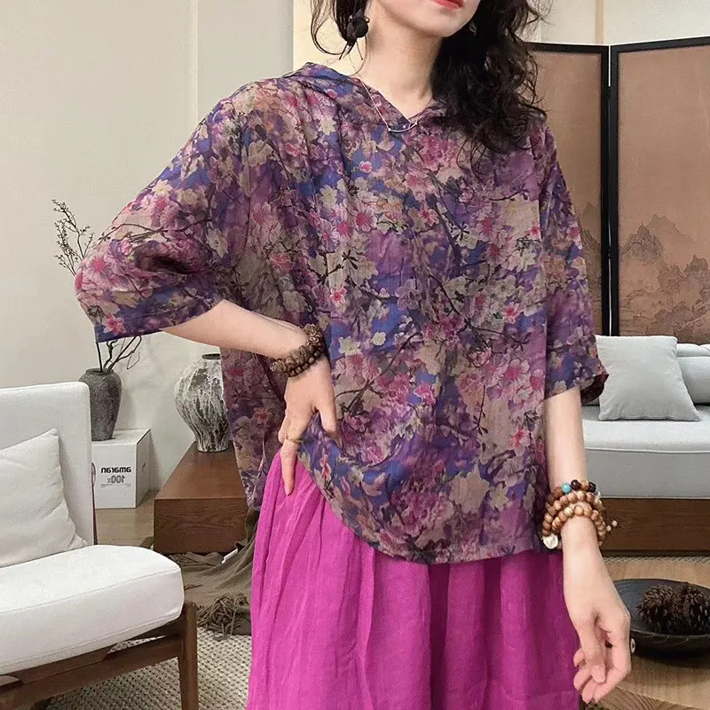 衣都精品- 新款數位印花連帽中袖文藝上衣