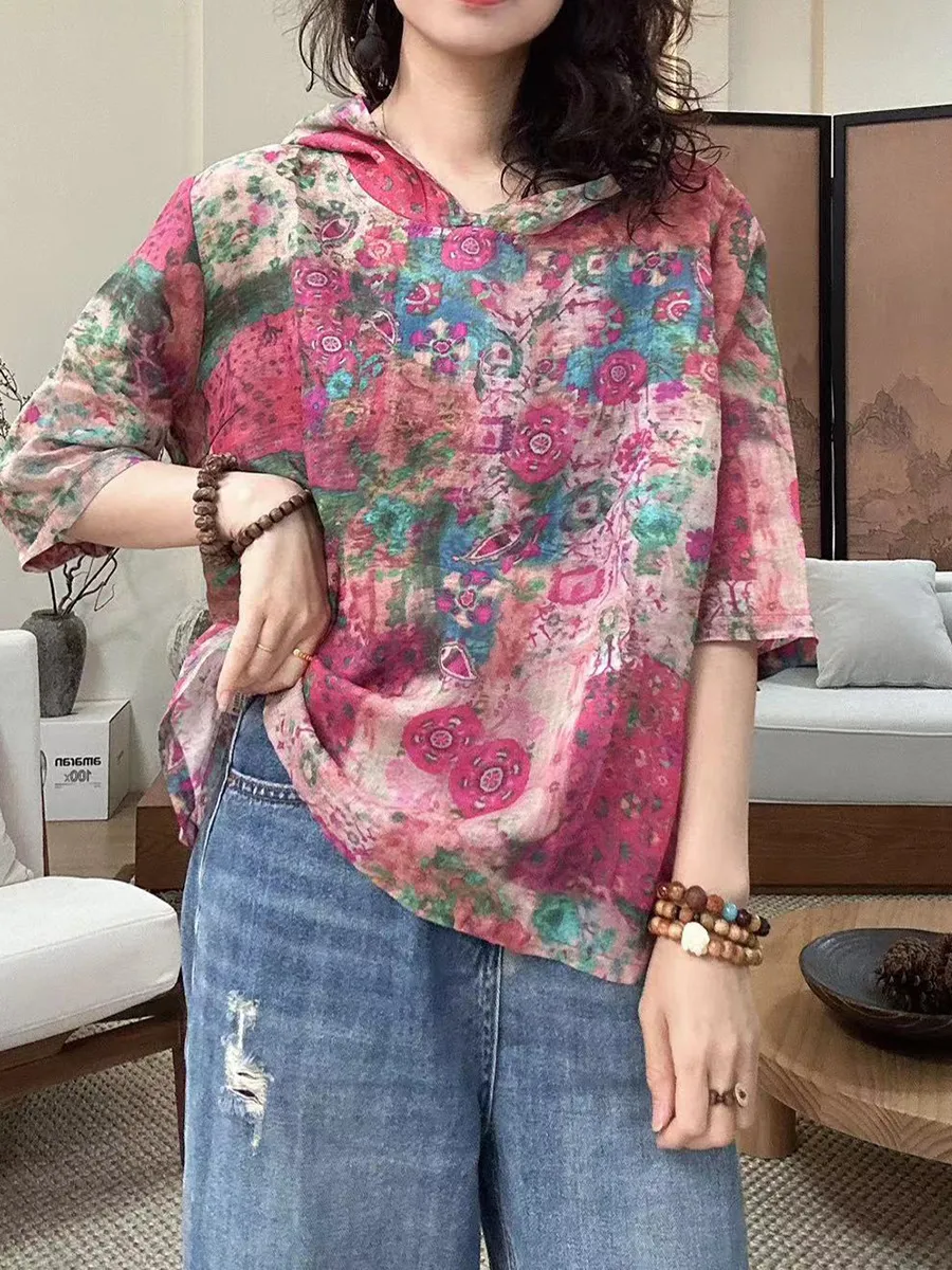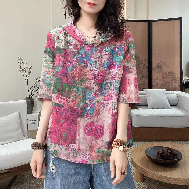 衣都精品- 新款復古民族風寬鬆休閒顯瘦印花七分袖上衣