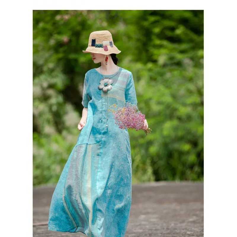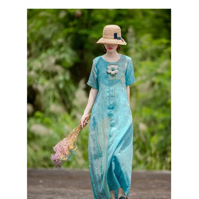 衣都精品- 新款文藝復古大碼寬鬆印花拼接連衣裙