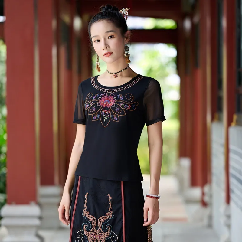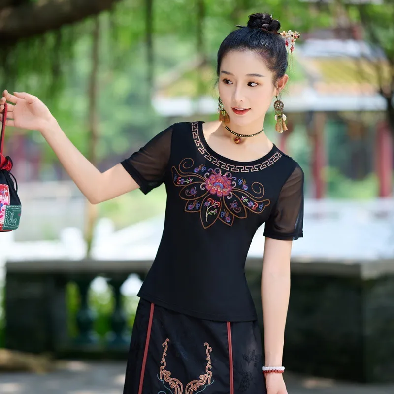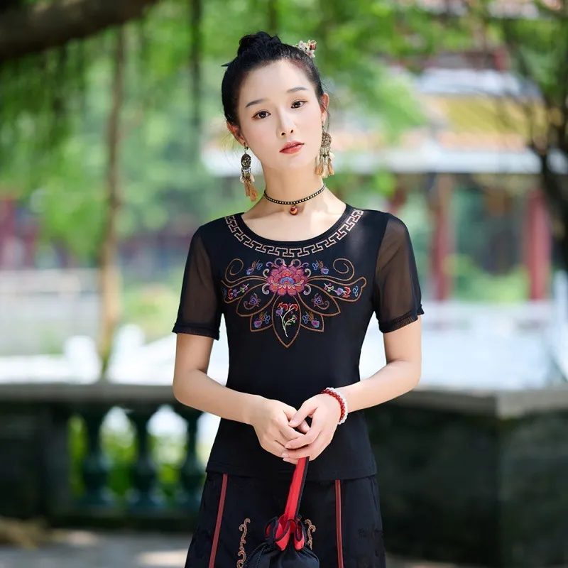 衣都精品- 新款民族風圓領刺繡網紗拼接顯瘦上衣