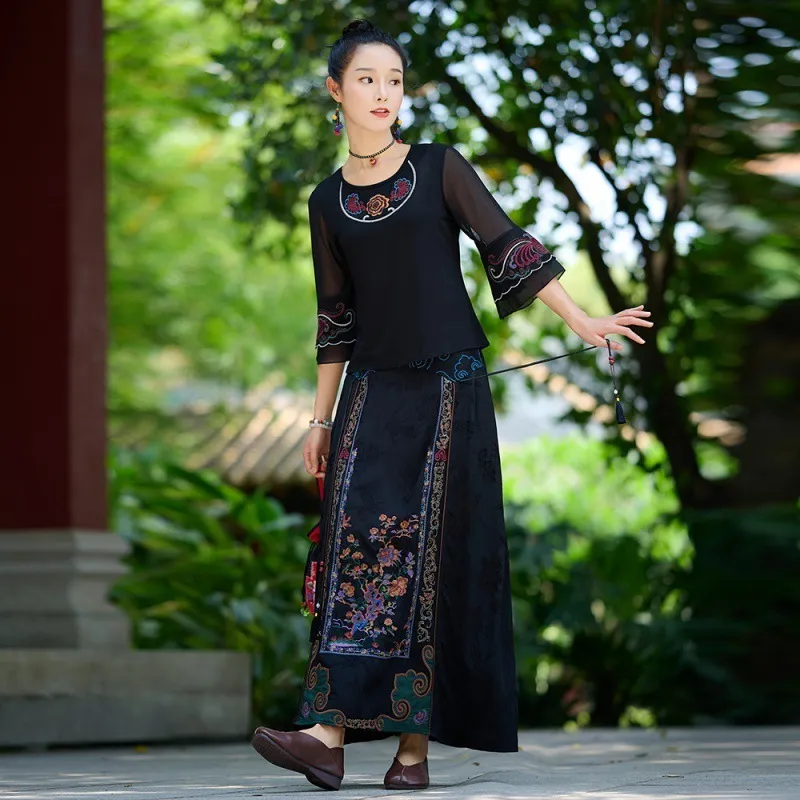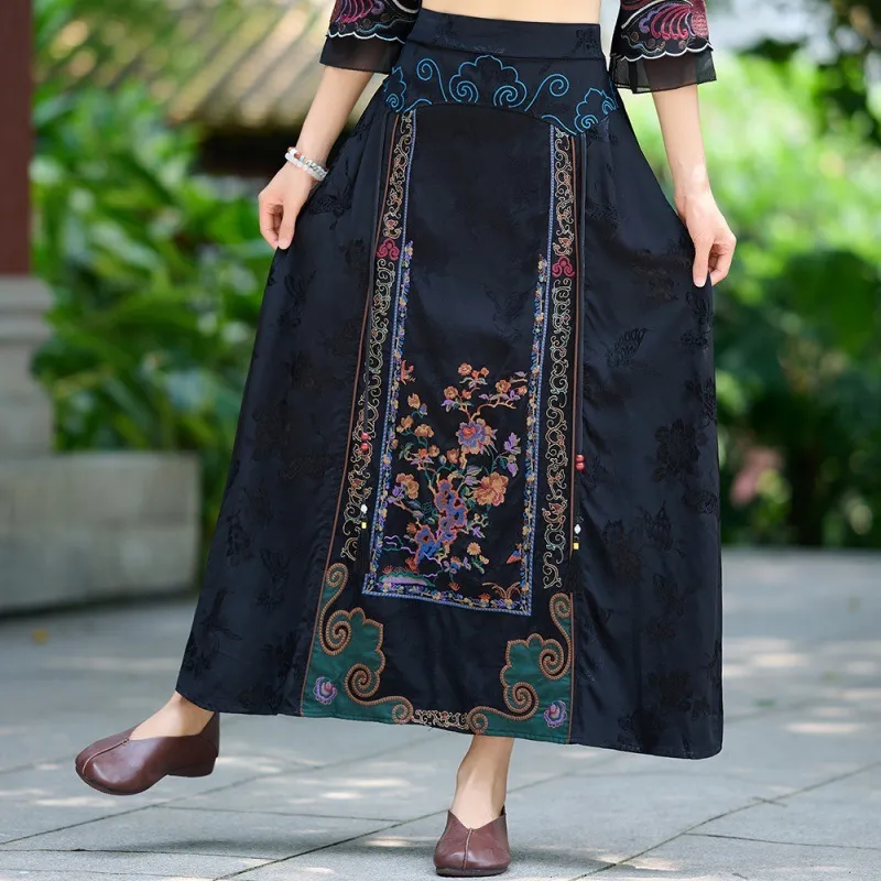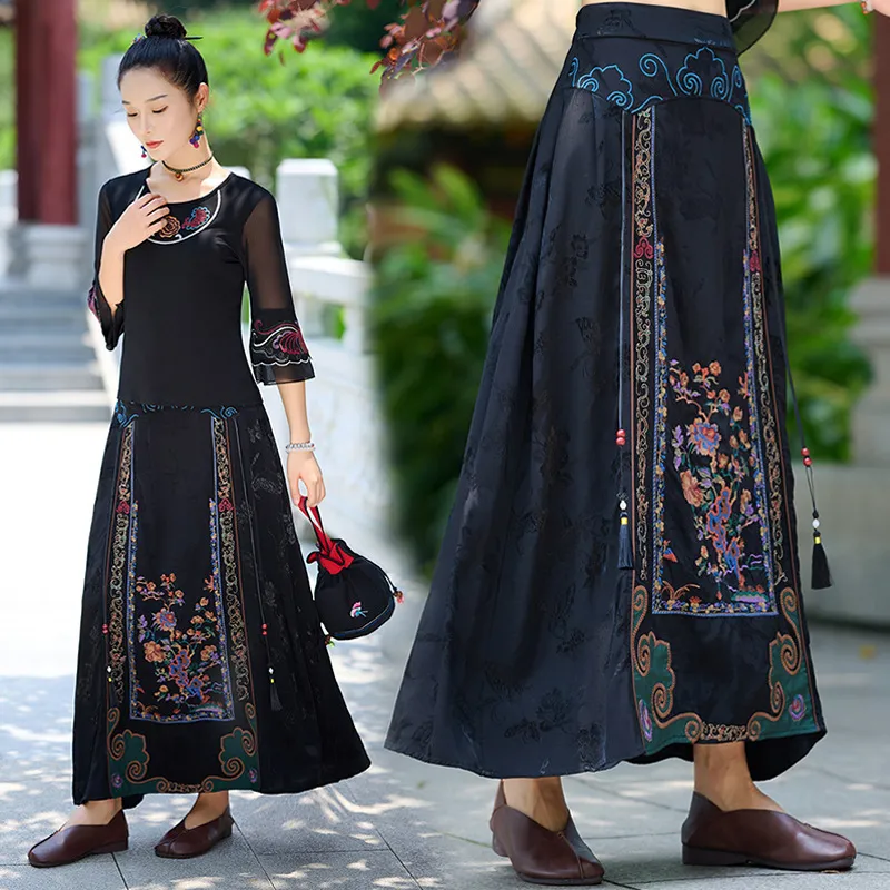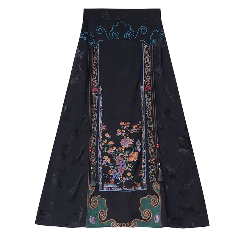 衣都精品- 新款民族風重工刺繡鬆緊腰裙緞面提花馬面裙