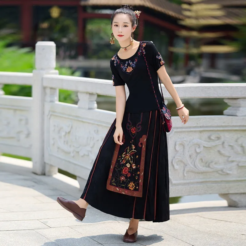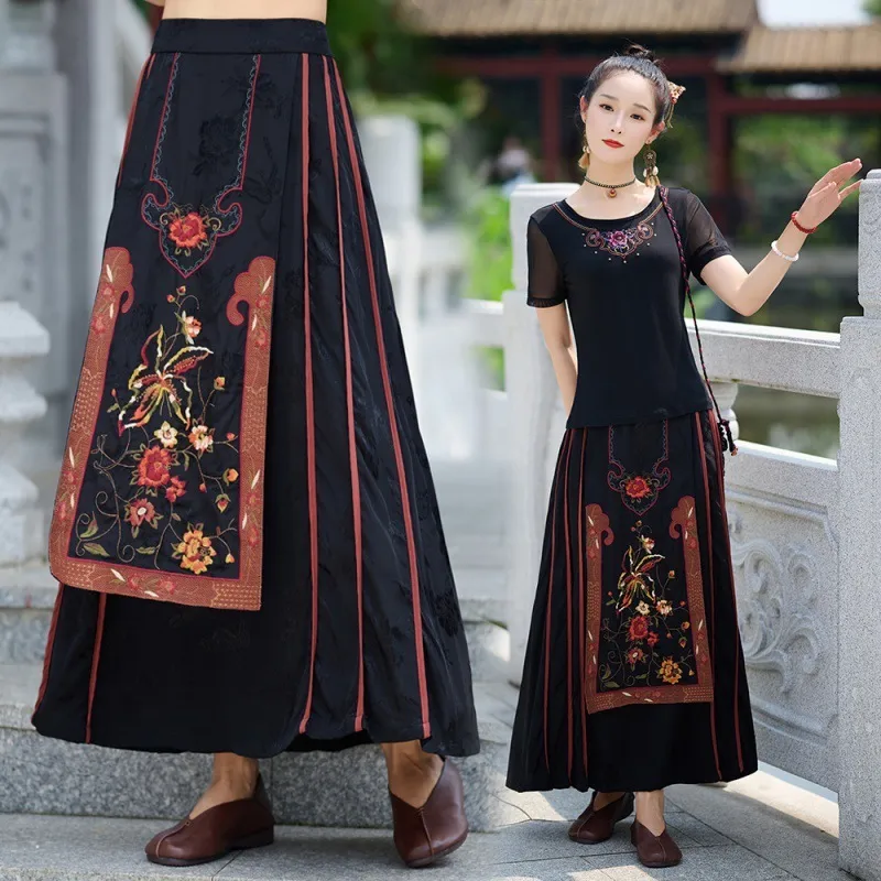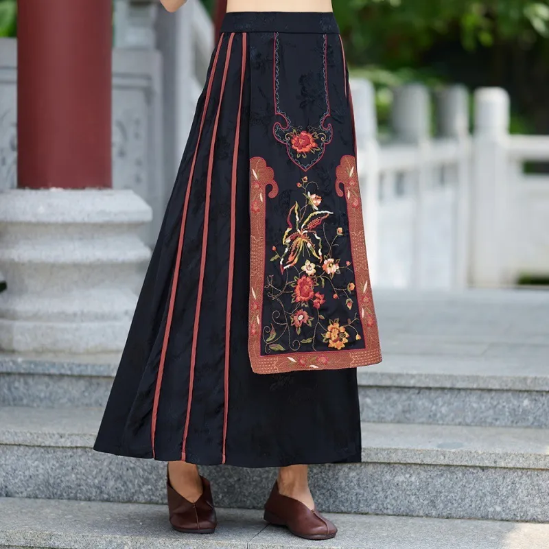 衣都精品- 新款民族風重工刺繡鬆緊腰裙緞面提花馬面裙