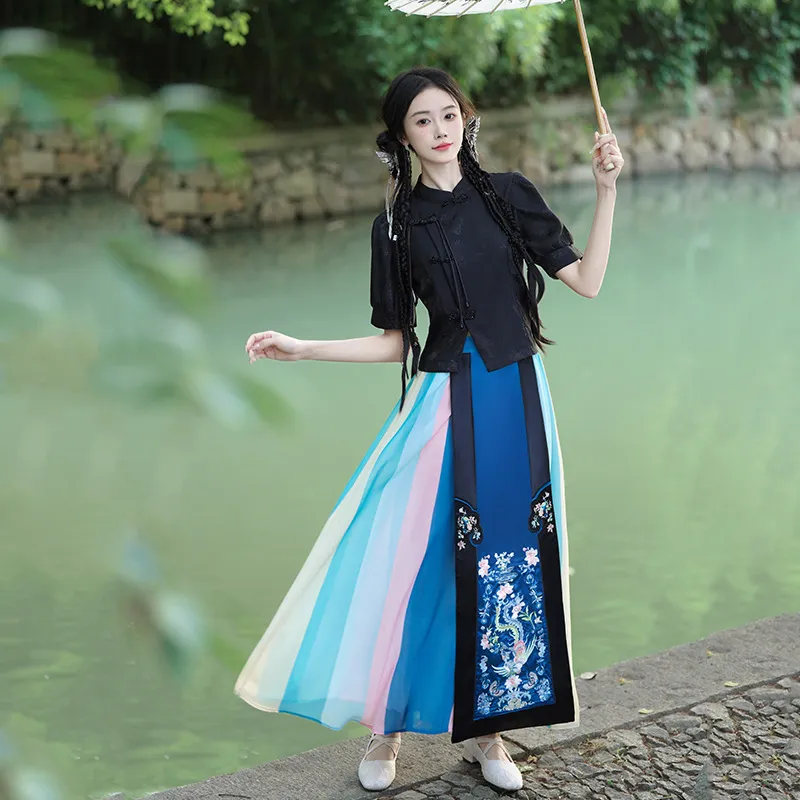 衣都精品- 新款民族風改良中式拼色刺繡半身裙
