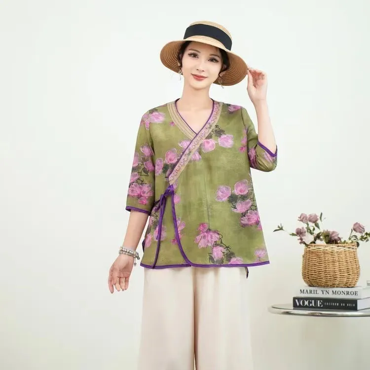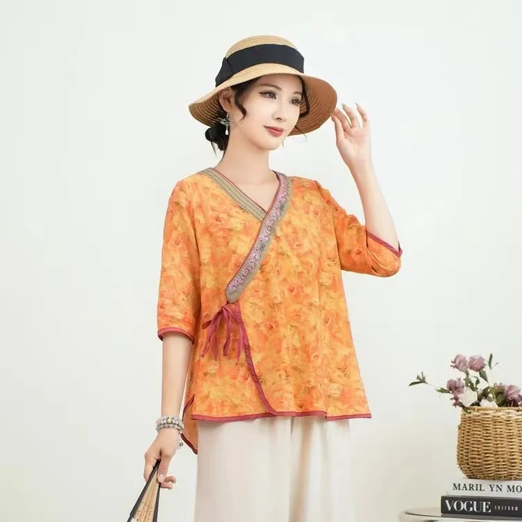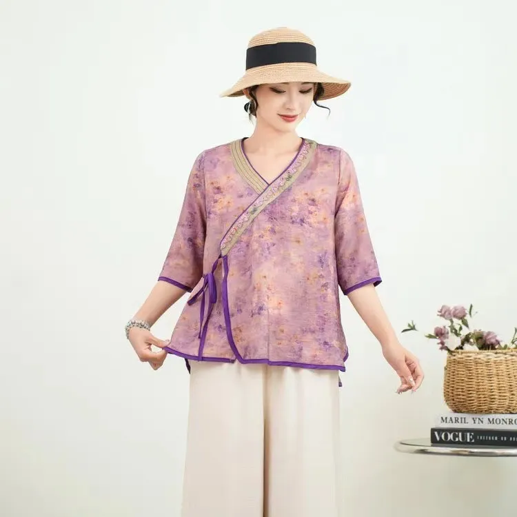 衣都精品- 新款數位印花文藝斜襟盤扣上衣