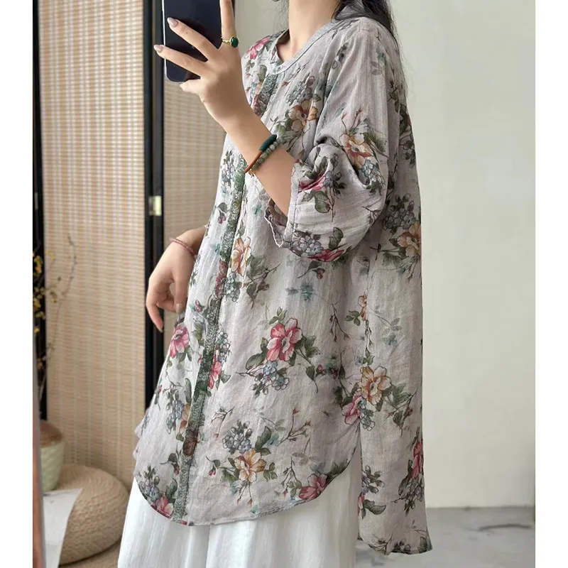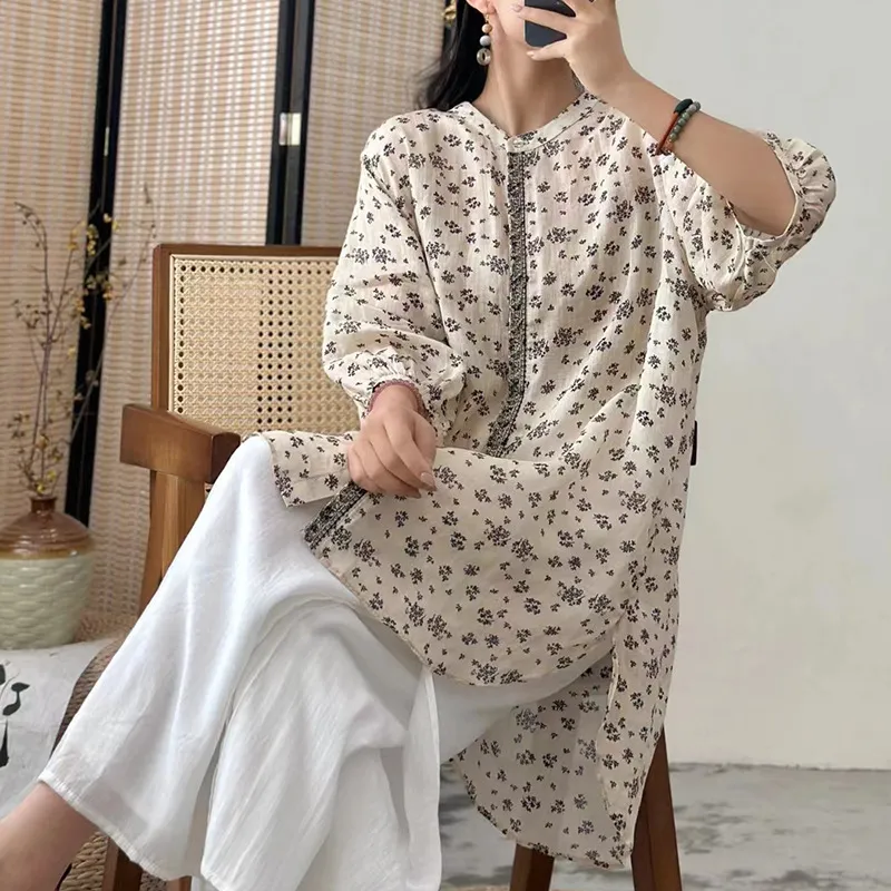 衣都精品- 新款民族風七分袖立領開襟文藝碎花長款上衣