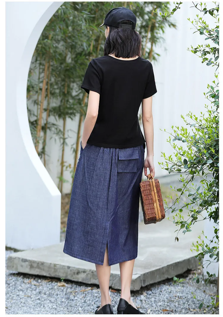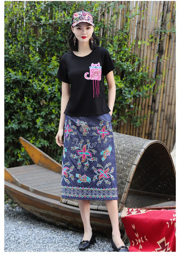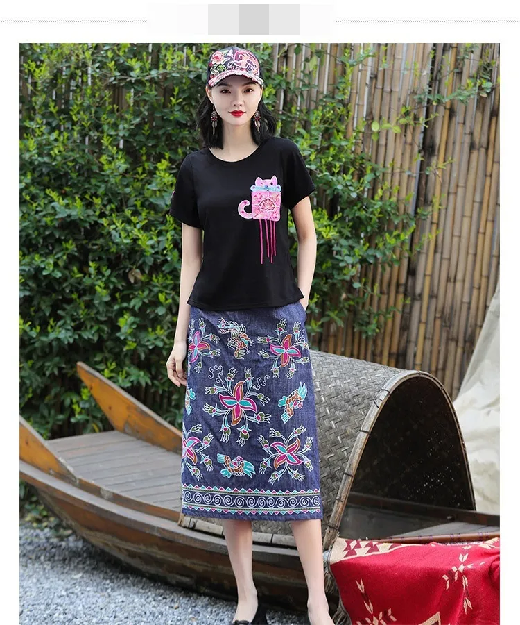 衣都精品- 新款民族風牛仔包臀繡花鬆緊腰半身裙