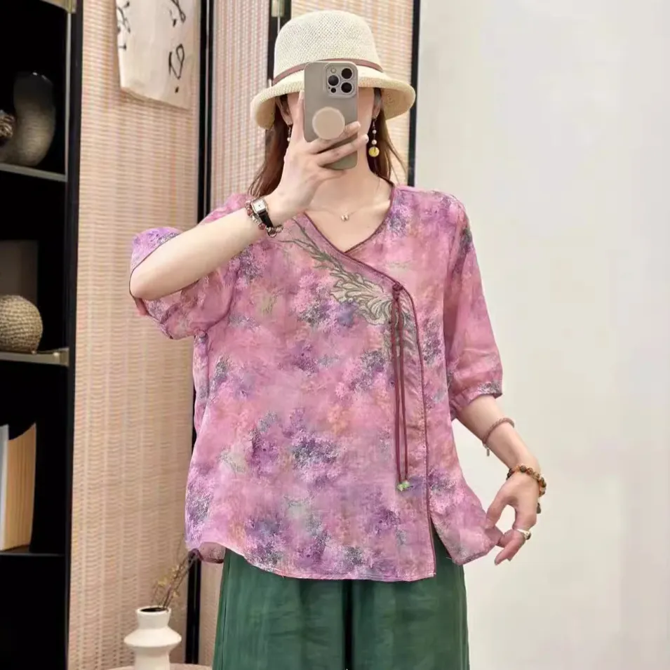 衣都精品- 新款復古寬鬆大碼印花V領中袖上衣