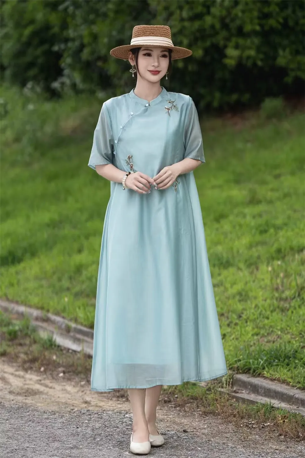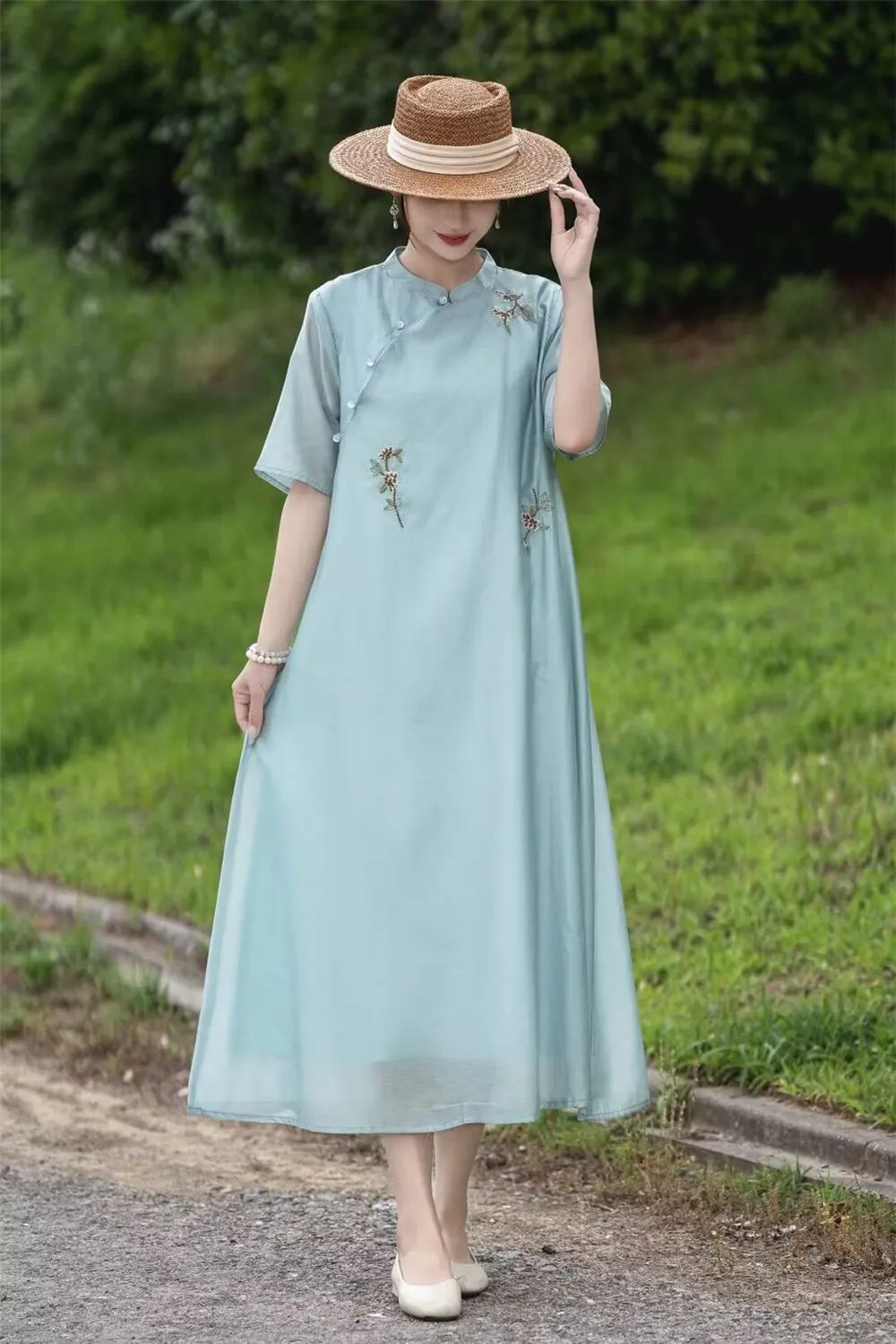 衣都精品- 新款文藝短袖立領刺繡雙層連衣裙