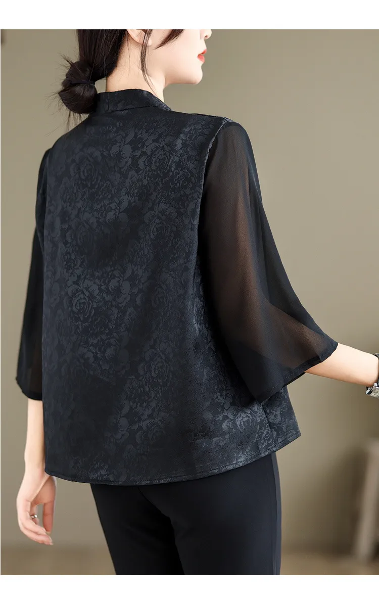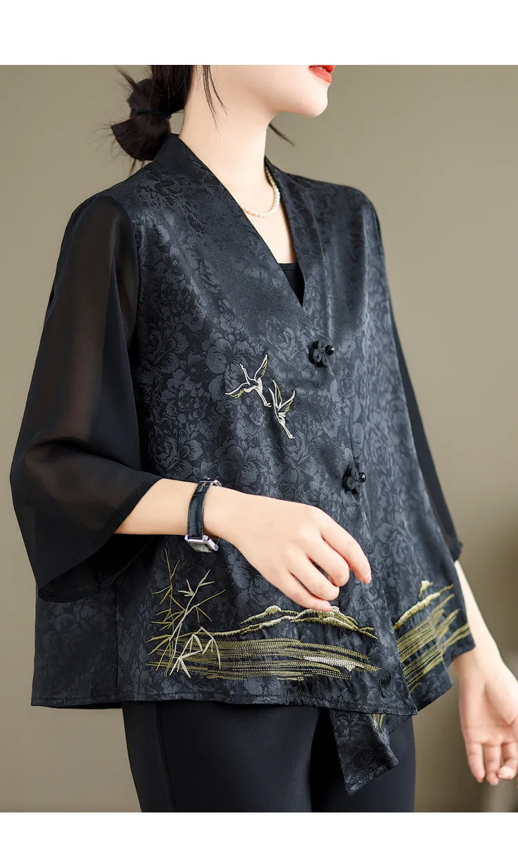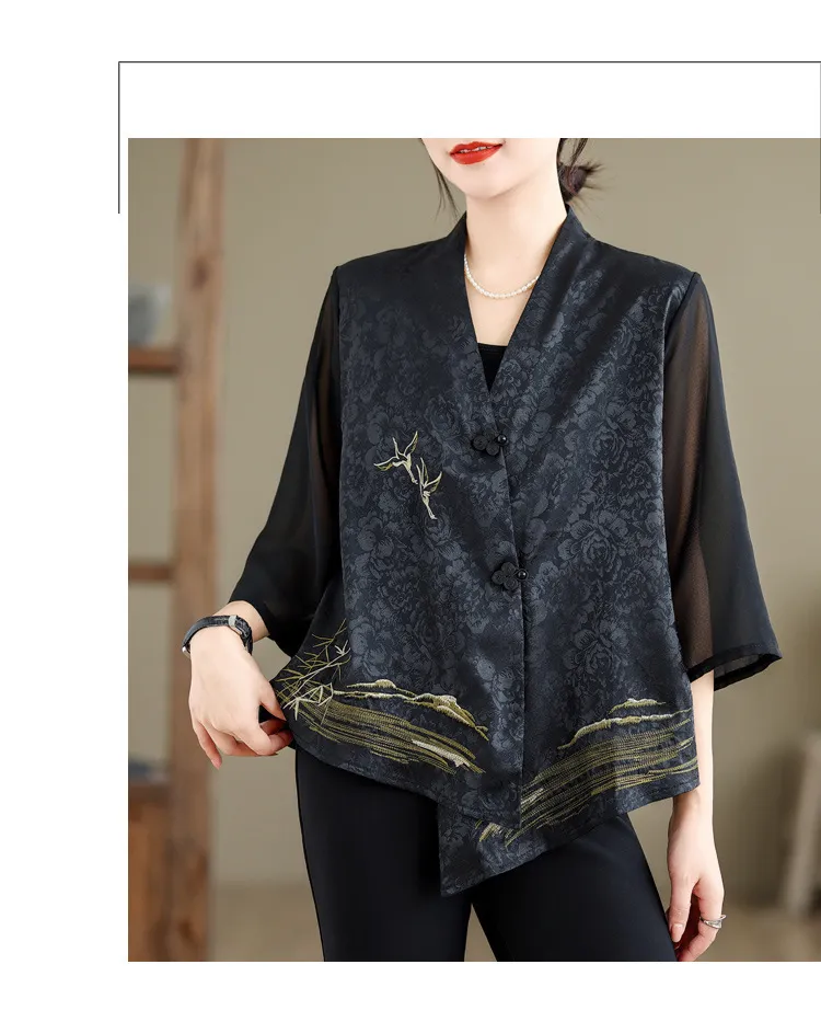 衣都精品- 新款復古不規則五分袖短版刺繡上衣