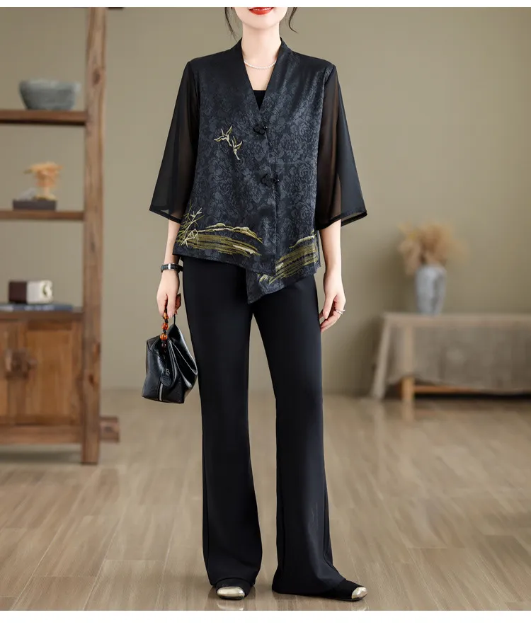 衣都精品- 新款民族風緞面提花寬鬆顯瘦闊腿褲