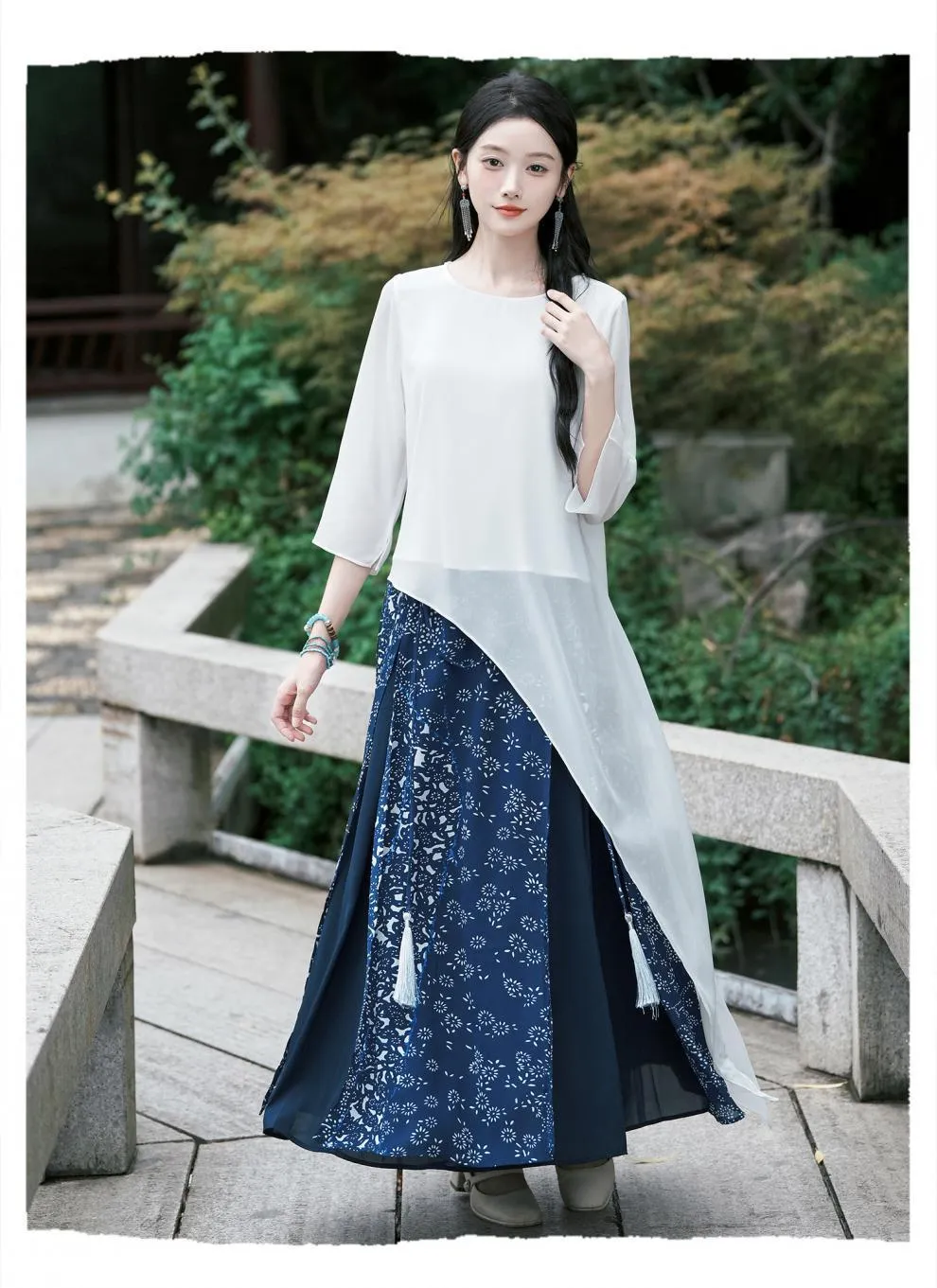 衣都精品- 新款復古刺繡下擺拼紗中袖開襟上衣
