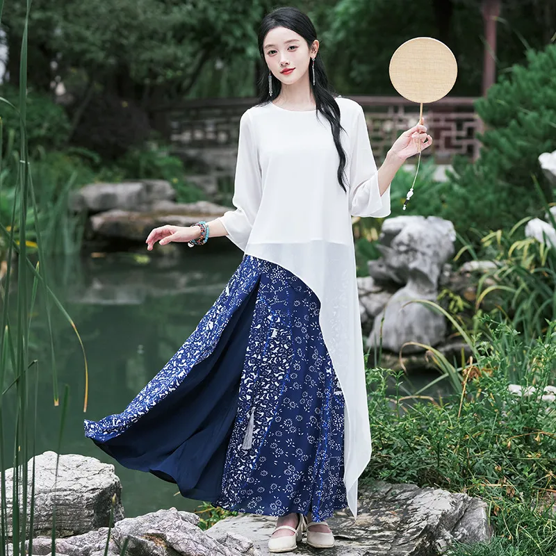 衣都精品- 新款中式國風紐扣印花短袖開叉拼接上衣