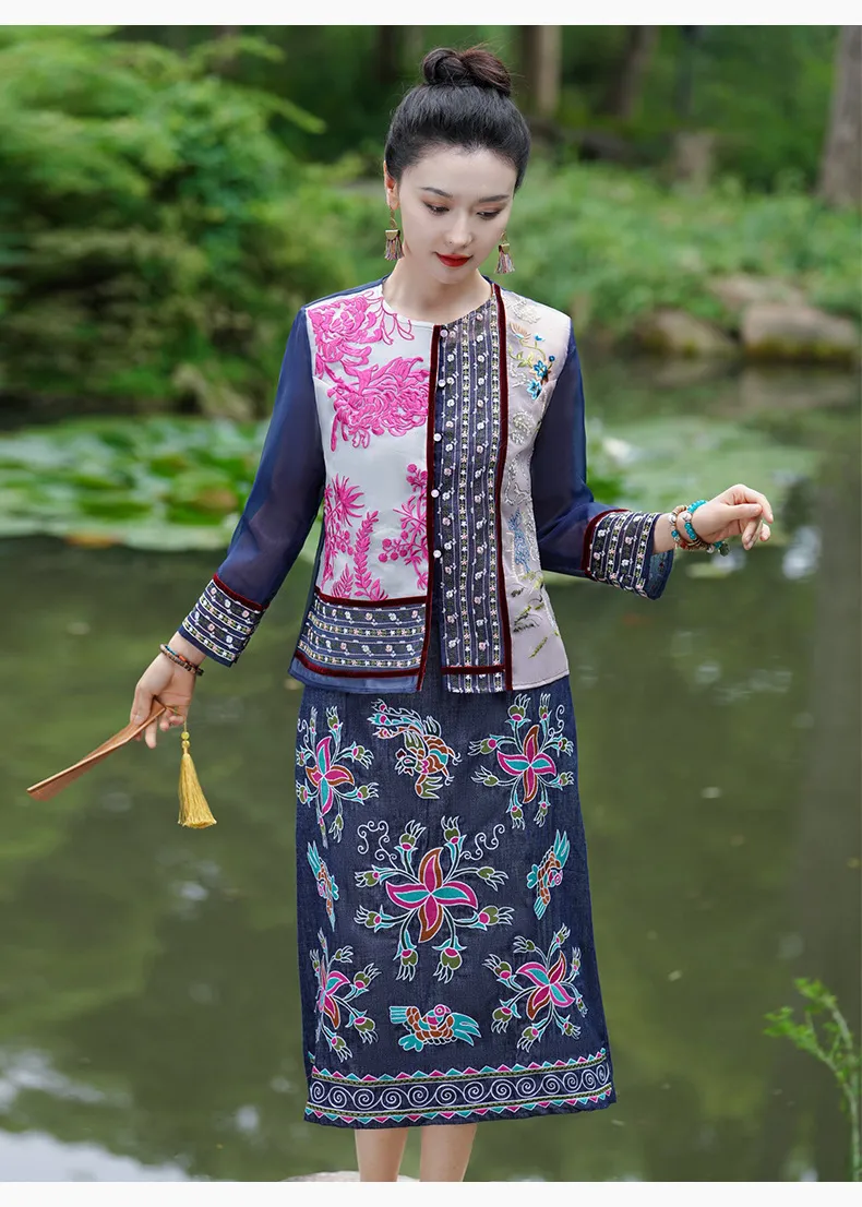 衣都精品- 新款復古刺繡下擺拼紗中袖開襟上衣