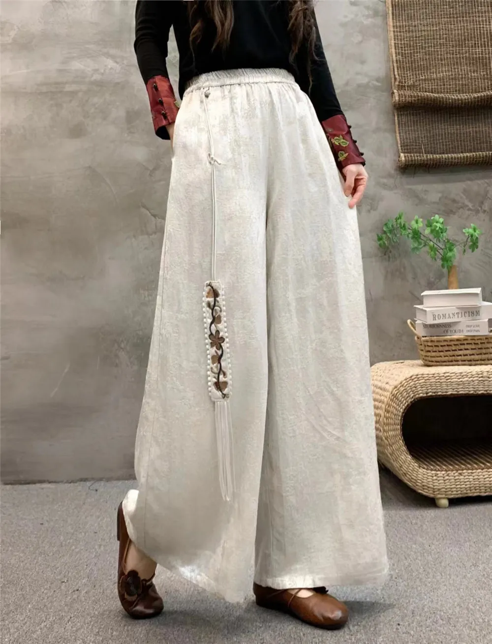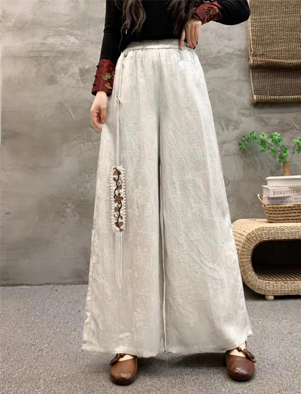 衣都精品- 新款純色提花流蘇鬆緊腰緞面混紡直筒褲