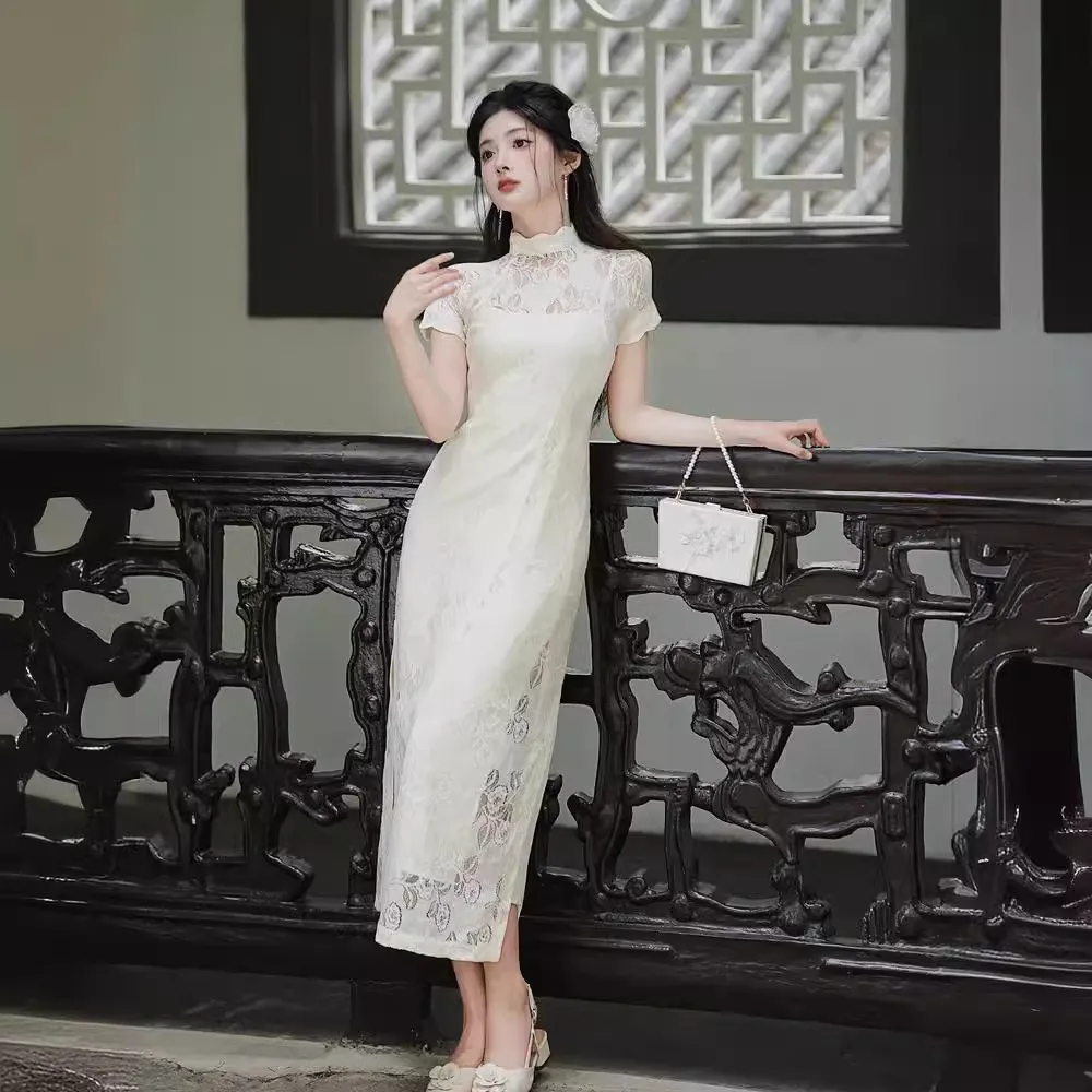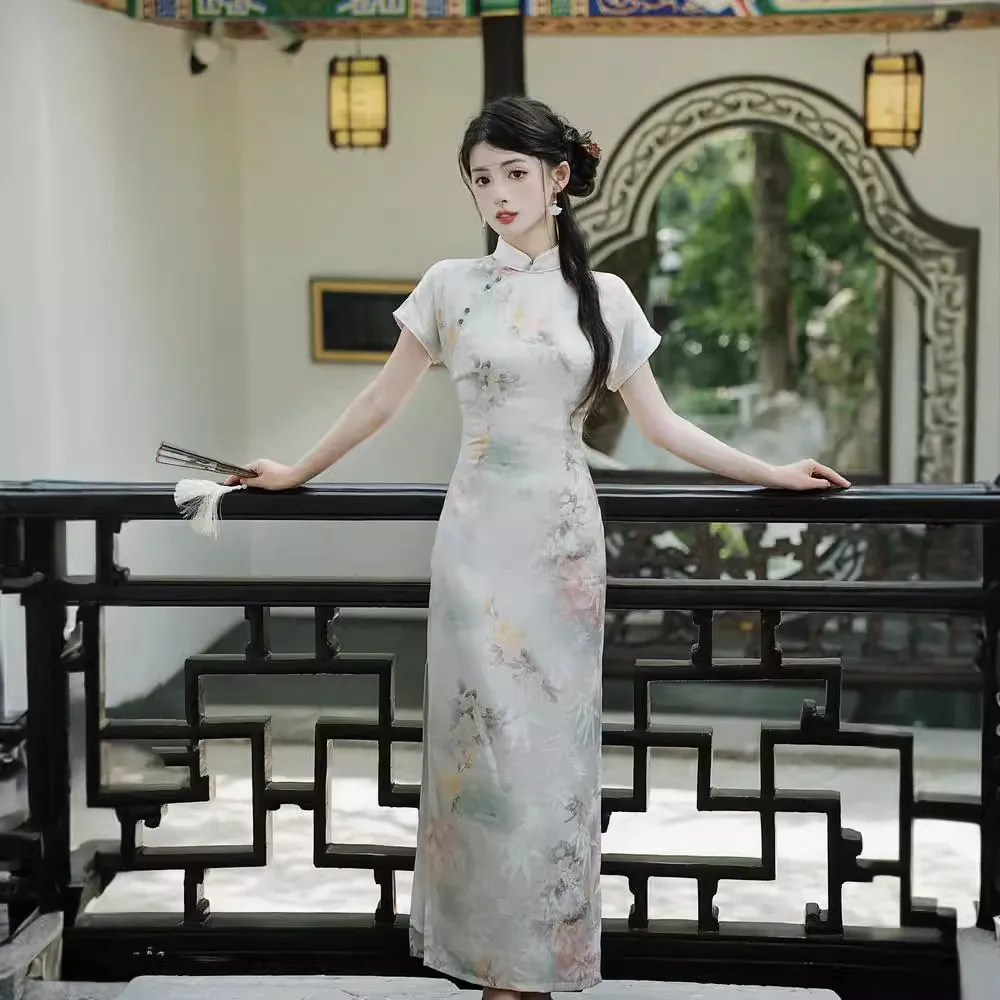 衣都精品- 新款復古立領印花氣質收腰修身短袖旗袍裙