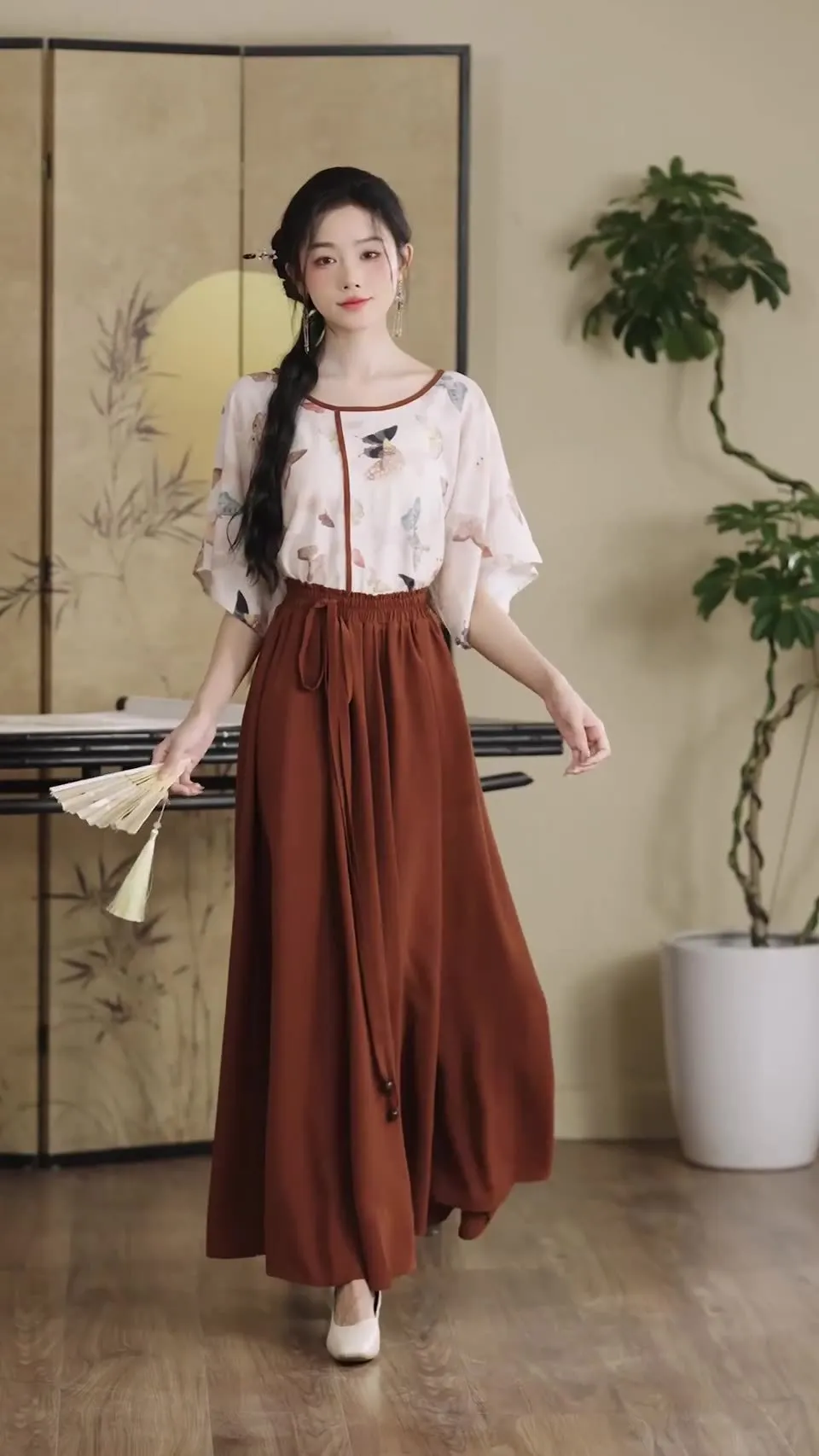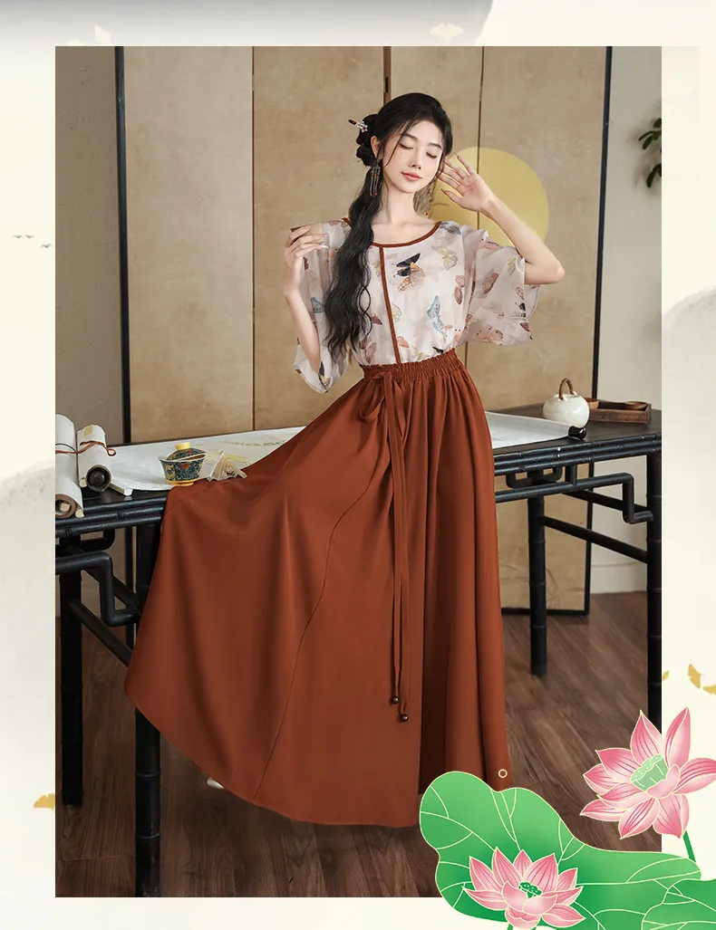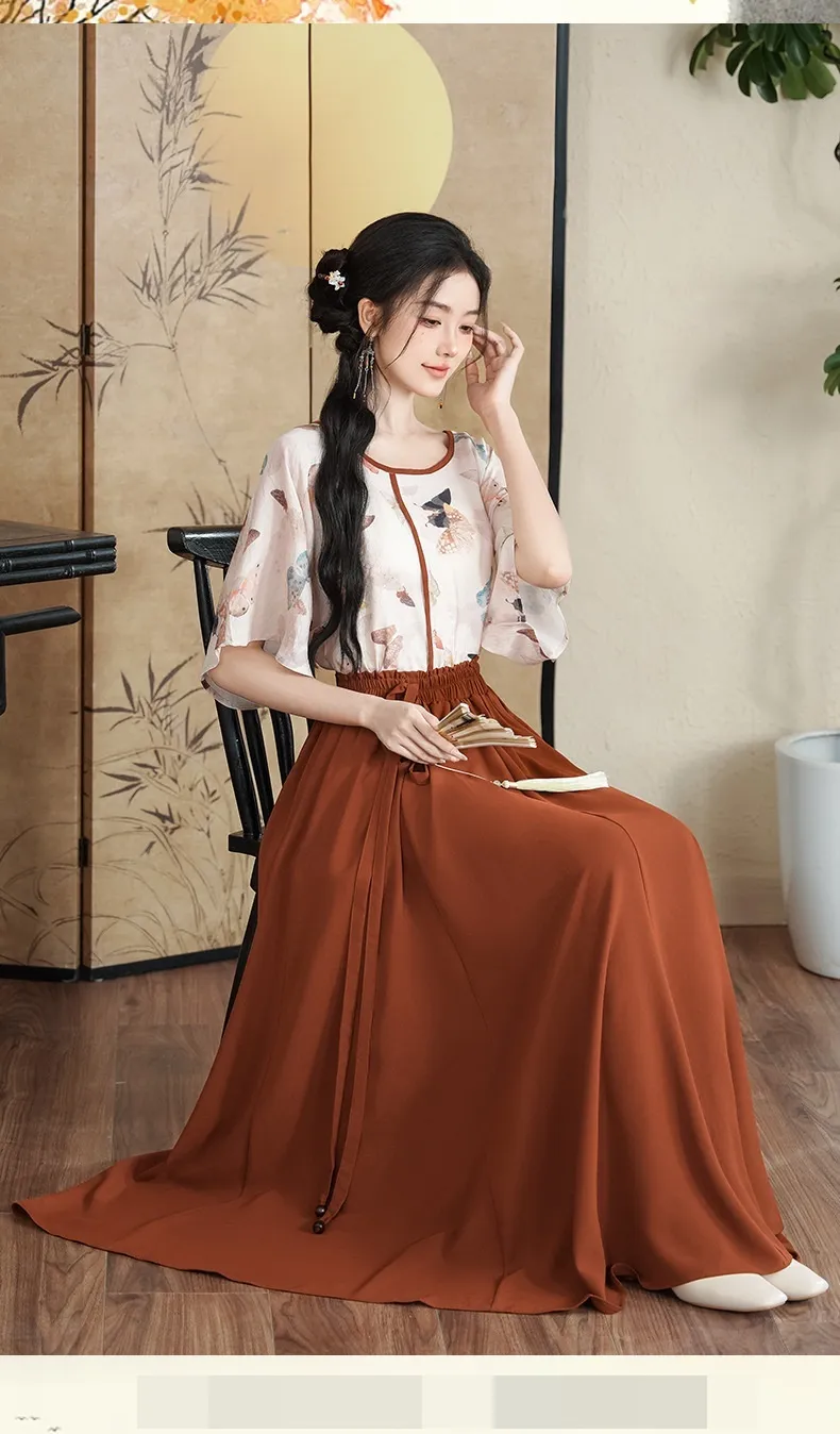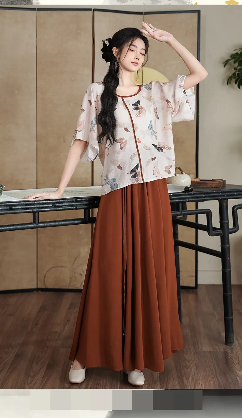 衣都精品- 新款中式圓領印花喇叭袖復古漢服上衣+半身裙兩件式套裝